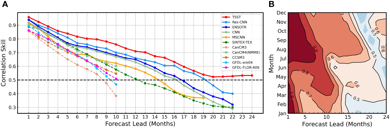 ENSO correlation skill TSST model. (A)The all-season correlation skill of Niño 3.4 as a function of forecast lead month in TSST model (red), Res-CNN model (dogerblue), ENSOTR model (blue), CNN model (darkseagreen) and other methods (the other colors). The validation period is between 1984 and 2017. Solid lines represent deep learning models, and dashed lines represent dynamical forecast systems. (B) The seasonality of correlation skills is further assessed as a function of lead time and calendar month for Niño 3.4, with contours of correlation skills exceeding the highlighted 0.5 value.