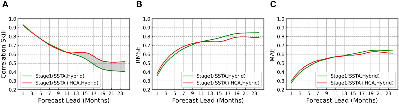 Comparison of ENSO prediction skills between the control and sensitivity experiments regarding meteorological variables. The all-season correlation (A), root mean square error (B) and mean absolute error (C) of Niño 3.4 as a function of forecast lead month in stage 1 using only SSTA and using both SSTA and HCA. The validation period is between 1984 and 2017.