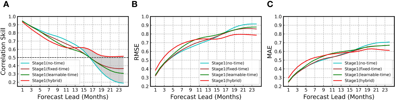 Comparison of ENSO prediction skills between the control and sensitivity experiments regarding temporal embedding. The all-season correlation (A), root mean square error (B) and mean absolute error (C) of Niño 3.4 as a function of forecast lead month in stage 1 for four temporal embedding strategies: no temporal embedding, fixed temporal embedding, learnable temporal embedding, and a hybrid approach combining fixed and learnable temporal embedding. The validation period is between 1984 and 2017. In the ultimate TSST model, during stage 2, inputs comprise combined predictions from Stage 1 (no-time) and Stage 1 (hybrid). SSTA and HCA are both used in these four models.