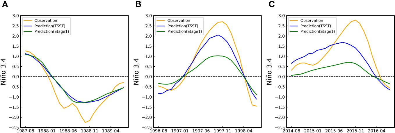 Figure 2B illustrates the correlation coefficients of our model’s predictions for each calendar month across lead months ranging from 1 to 24 on the test dataset. Generally, when the lead months are shorter, the prediction task is less challenging, leading to favorable prediction outcomes. On the contrary, as the lead months increase, the prediction difficulty escalates, resulting in less accurate predictions. Additionally, the difficulty of ENSO forecasting varies across different calendar months and is closely linked to the developmental stages of ENSO events. Starting from January and extending to April, ENSO is in its early developmental stage, resulting in relatively lower predictability. This might be attributed to the intricate interaction between sea surface temperatures and atmospheric circulation during this period, leading to the influence of multiple climatic variables on ENSO signals and subsequently weaker correlations. From May to August, ENSO reaches its mature phase, showing higher predictability. This is likely due to the gradual clarification of the relationship between sea surface temperature anomalies and atmospheric circulation, resulting in more pronounced event signals and stronger correlations. Moving on to September through December, corresponding to the middle-to-late declining phase of ENSO events, predictability remains relatively high. This could be attributed to the weaker interaction between sea surface temperatures and atmospheric circulation, diminishing interference in ENSO signals, a decreased impact of other climatic patterns on predictions, and reduced noise levels. Similar observations were also made in the predictions for Niño 3 and Niño 4 (Supplementary Figures S6, S7).