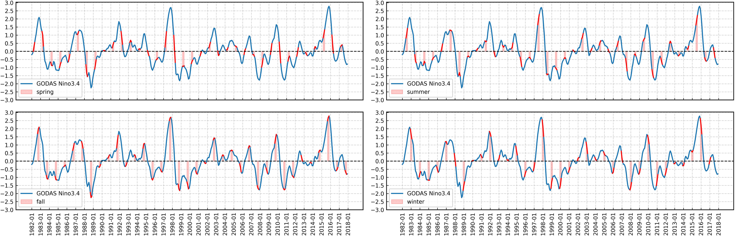 In addition, influenced by factors like solar radiation and Earth’s rotation Chapanov et al. (2017), ENSOrelated meteorological sequences often display pronounced calendar month and seasonal characteristics, particularly in ENSO development, prediction accuracy, and precursor signals Ham et al. (2021). Firstly, an ENSO event typically begins to develop during boreal spring, rapidly grows during summer and autumn, and reaches its maximum amplitude in winter. These different phases of ENSO events can be distinguished based on calendar months and seasons, showing a seasonal phase-locking pattern Dommenget and Yu (2016). This can be explained as low-order chaotic behavior driven by the seasonal cycle Tziperman et al. (1994); Tziperman et al., 1995). Some studies also reveal that the seasonally modulated termination process of big El Niño events is related to a combination mode, which originates from the atmospheric nonlinear interaction between ENSO and the Pacific warm pool annual cycle Stuecker et al. (2013); Ren et al. (2016). Secondly, the predictability of ENSO events varies across months and seasons. For instance, during boreal spring when ENSO is in its formation phase, the ENSO signal is relatively weak and susceptible to interference from other signals, leading to higher forecasting challenges in spring, known as the spring prediction barrier Lopez and Kirtman (2014). Thirdly, ENSO precursors also exhibit seasonality. For example, the Indian Ocean Dipole (IOD) reaches its peak strength in autumn but is negligible in other seasons Lestari and Koh (2016).