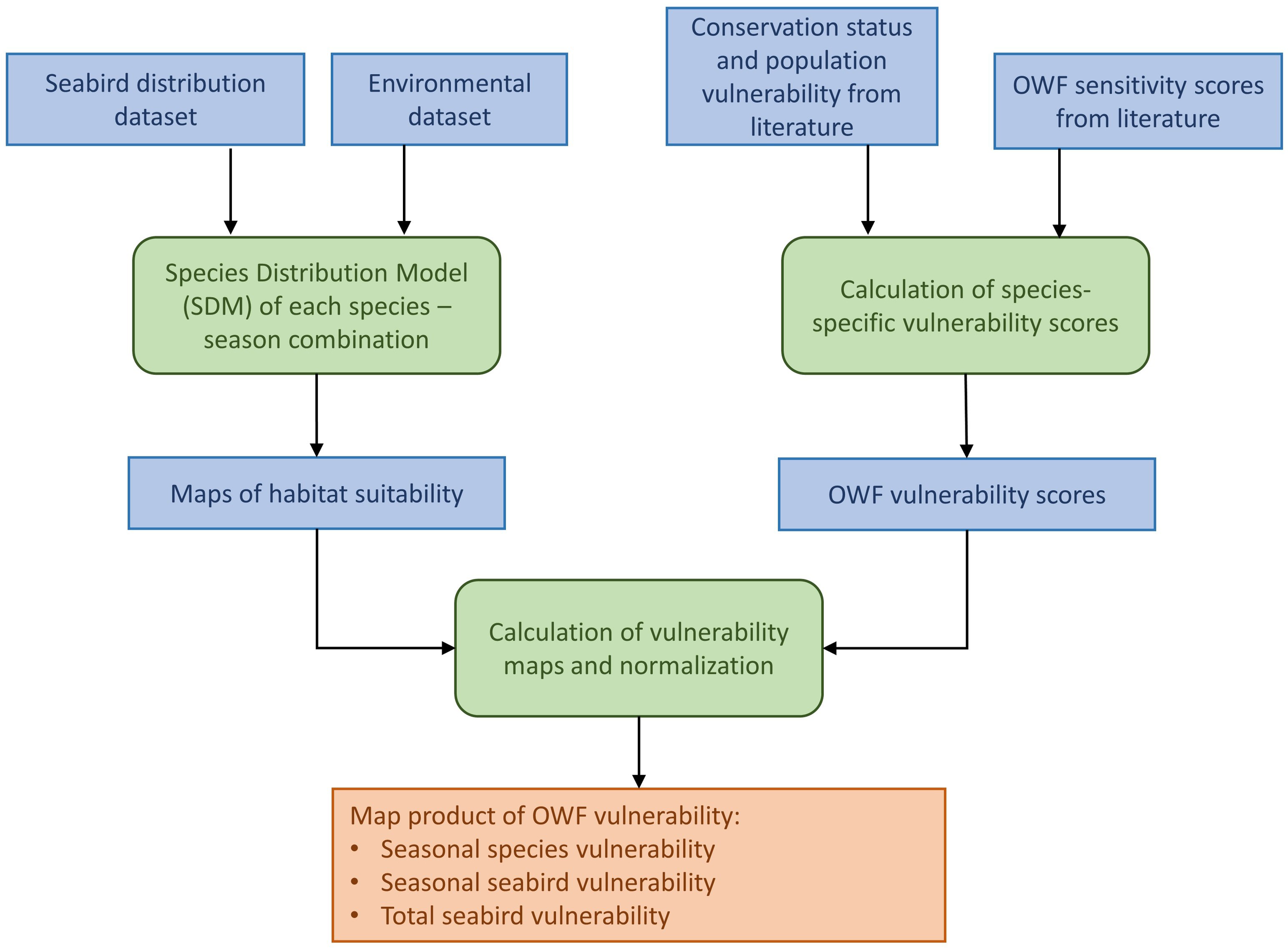 Workflow, including input data sets (blue boxes) and analyses (green boxes) to obtain a map product of seabird vulnerability to offshore wind farms (OWF).