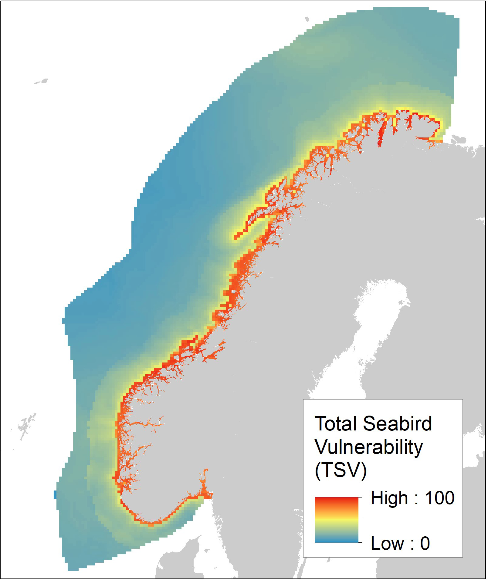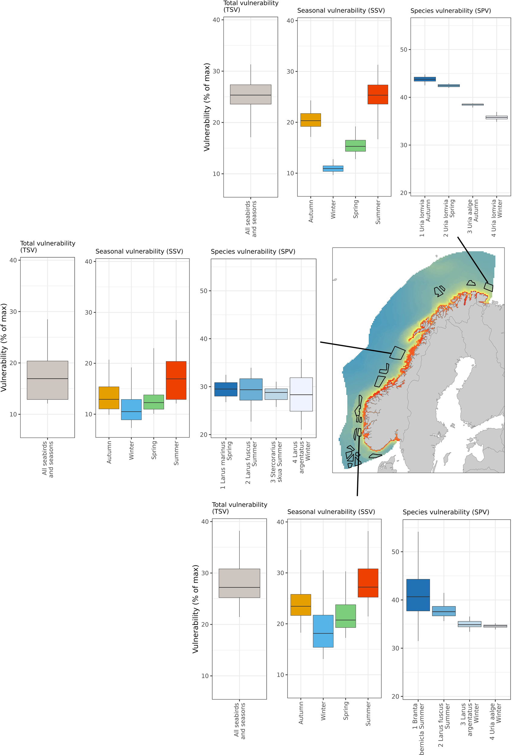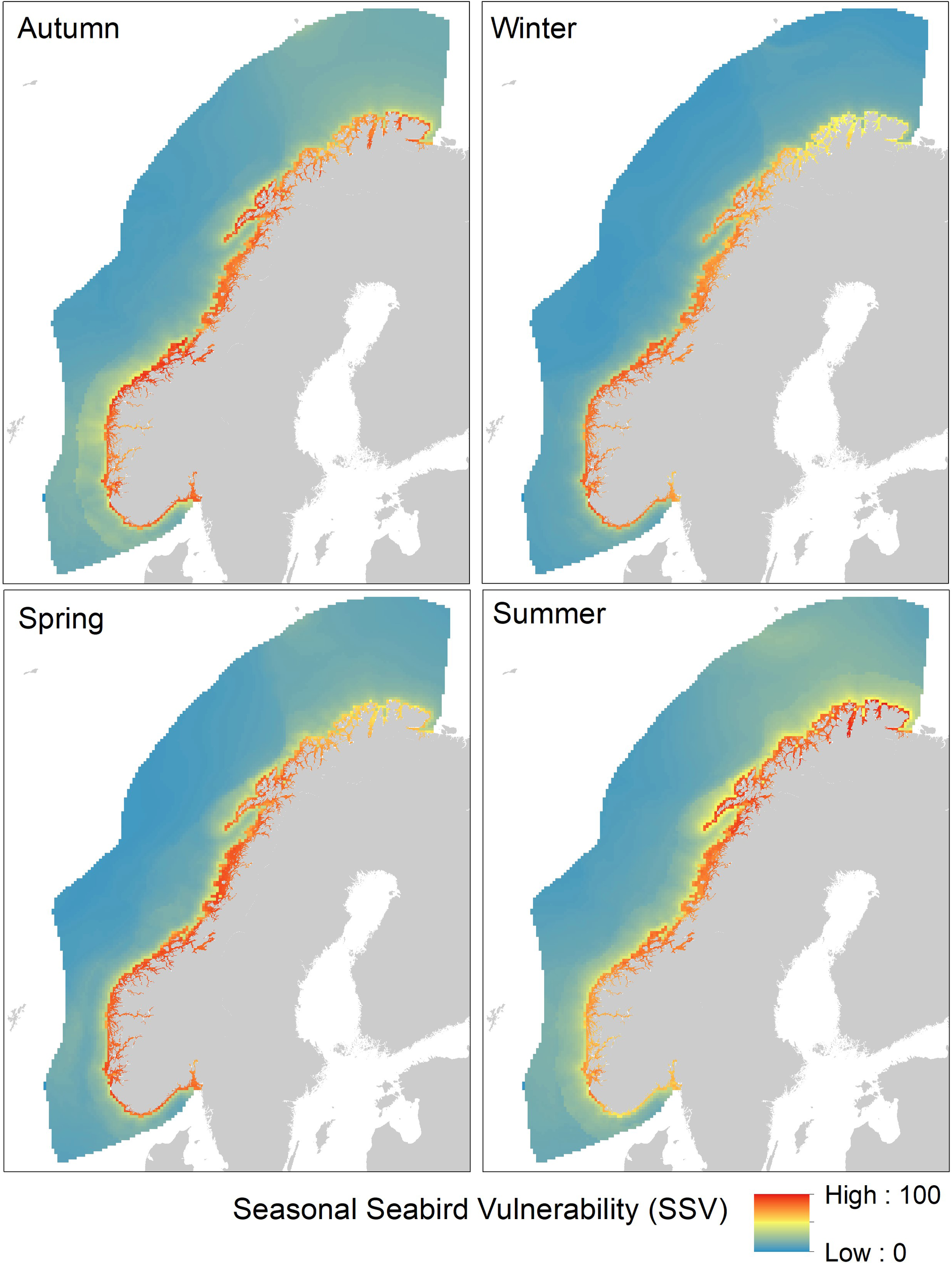 The species-specific vulnerability scores and maps of habitat suitability were combined to yield a map product consisting of three spatial indicators representing three different levels of detail: (1) Species Vulnerability (SPV)Equation 7 which maps the vulnerability of each species and season, (2) Seasonal Seabird Vulnerability (SSV)Equation 8 which sums the Species Vulnerability in each season, and (3) Total Seabird Vulnerability (TSV)Equation 9 which maps the maximum Seasonal Seabird Vulnerability.