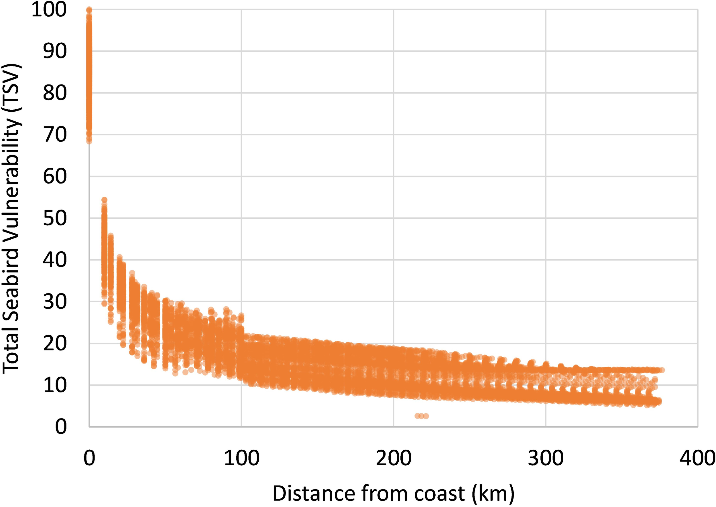 The indicators were summed into a cumulative vulnerability map for marine birds in the assessment area. Our approach builds on the methods developed by Garthe and Hüppop (2004) and Furness et al. (2013) for quantifying species-specific vulnerability, and on Bradbury et al. (2014) and Kelsey et al. (2018) for distributing the vulnerability scores in the assessment area using spatial models of seabird distribution. As a further refinement of Bradbury et al. (2014) and Kelsey et al. (2018), our approach combines different data sources to model habitat suitability, making it possible to assess the vulnerability of relevant species in the entire assessment area.