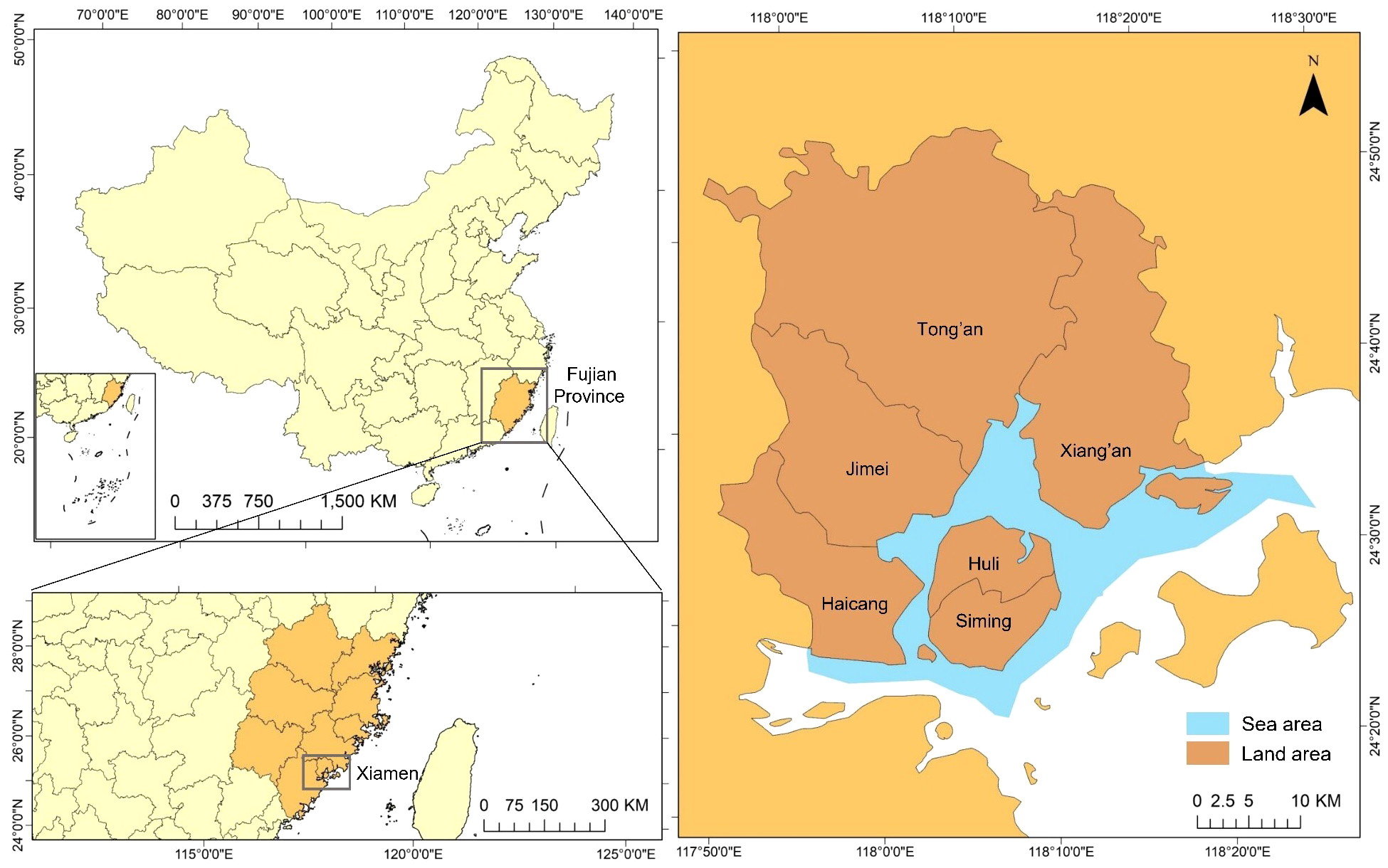 Xiamen is a city born by the sea in southeastern China, adjacent to the Taiwan Strait (Figure 1). By 2021, Xiamen had a land area of 1,698.78 km2 and a sea area of approximately 390 km2, with a resident population of 5.28 million. Its urban core grew up from southern Xiamen Island. Xiamen Island lies about one degree north of the Tropic of Cancer. The north is Huli District, and the south is Siming District. Its mainland territory is divided among Haicang, Jimei, Tong’an, and Xiang’an districts.