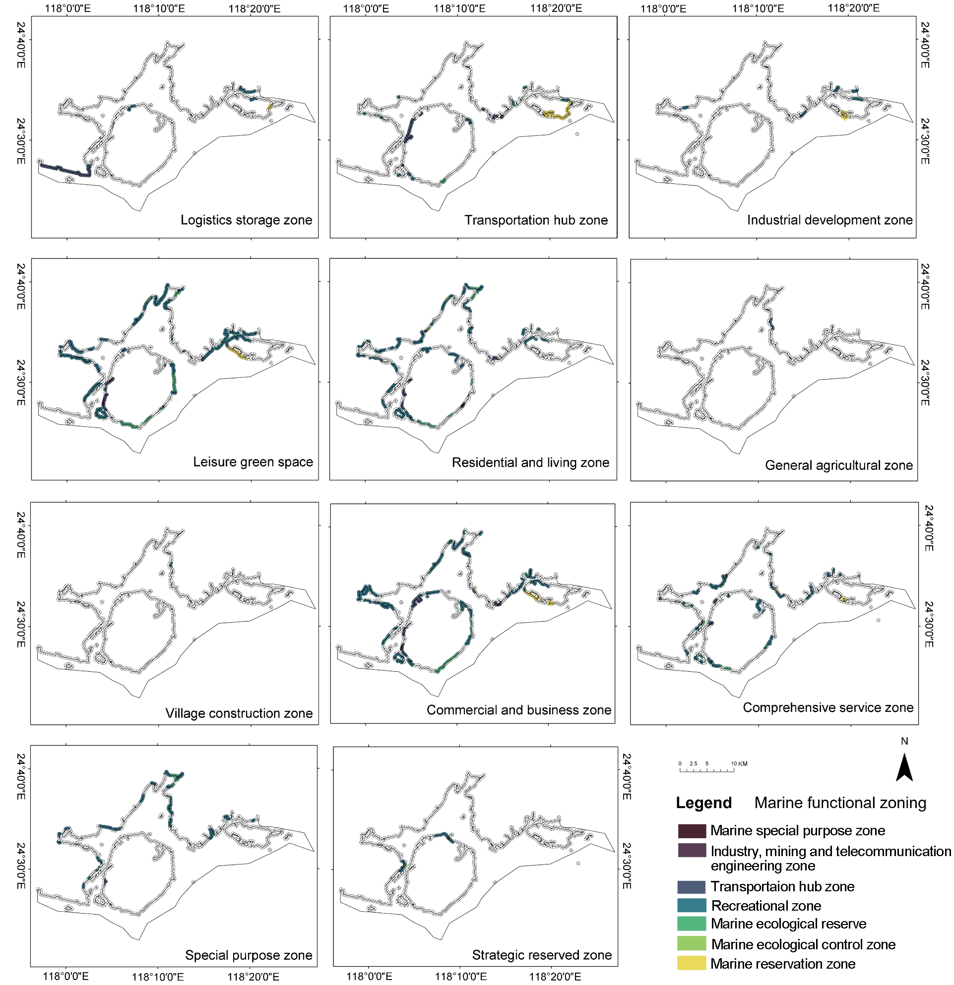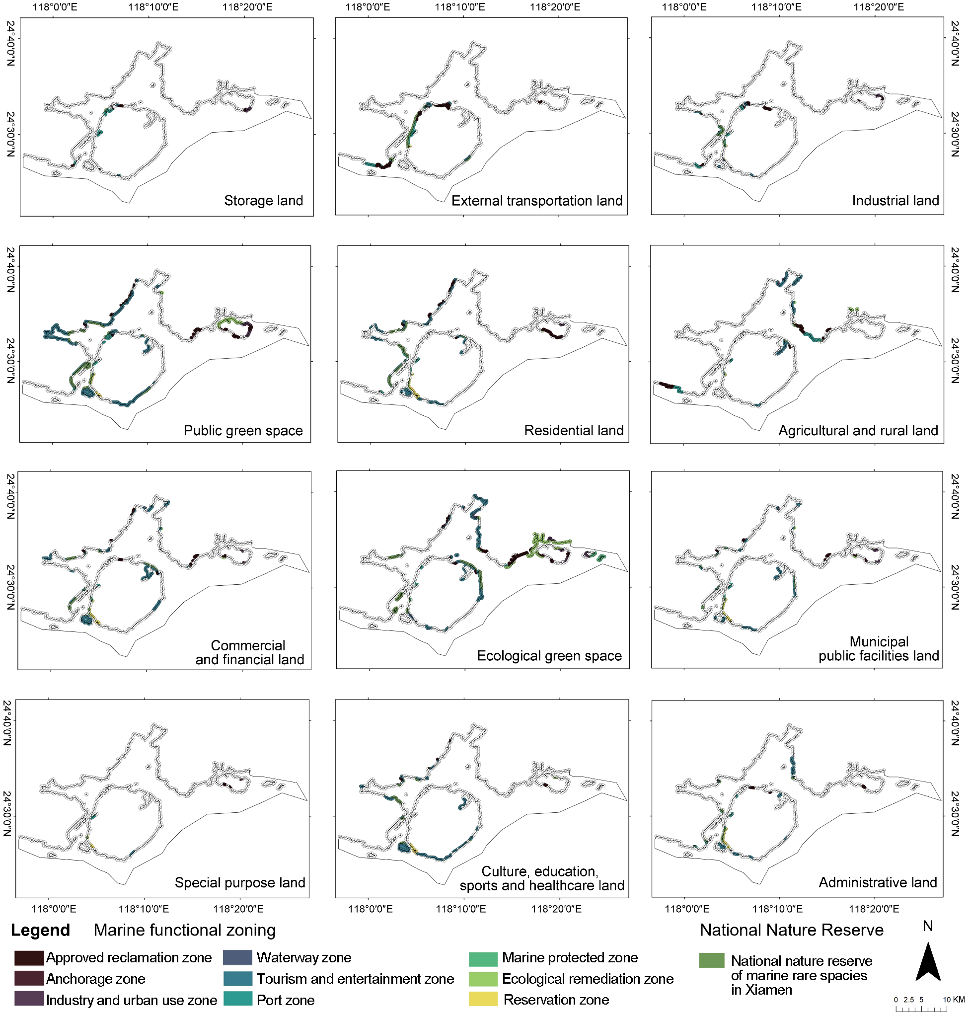 Before and after the reform of spatial planning system, the names of functional zones changed. Therefore, we first compared the types of functional zones before and after the reform. Before the reform, the division of the land functional zones is mainly determined by Xiamen Master Plan (2003–2020), which contains 12 functional zones. The division of functional zones in the sea area is mainly planned by Xiamen Marine Functional Zoning (2013–2020). There are 7 first categories of marine plane functional zones. Besides, there are three rare marine species, namely Chinese white dolphins, amphioxus and egrets. In this study, we only considered the core zones of the nature reserve for these three species according to the Master Plan for National Nature Reserve of Xiamen Rare Marine Species, and did not include the outer areas, because the outer areas basically cover all the sea areas under the jurisdiction of Xiamen. After the reform, various natural resources, including land and sea, were treated as a whole, so various plans were merged into one to balance and achieve multiple planning objectives on a map. The new integrated coastal zone planning of TSP covers sea areas and islands under the jurisdiction of the provincial government’s seaward (12 nautical miles) and covers the land under the jurisdiction of coastal county-level governments landward.