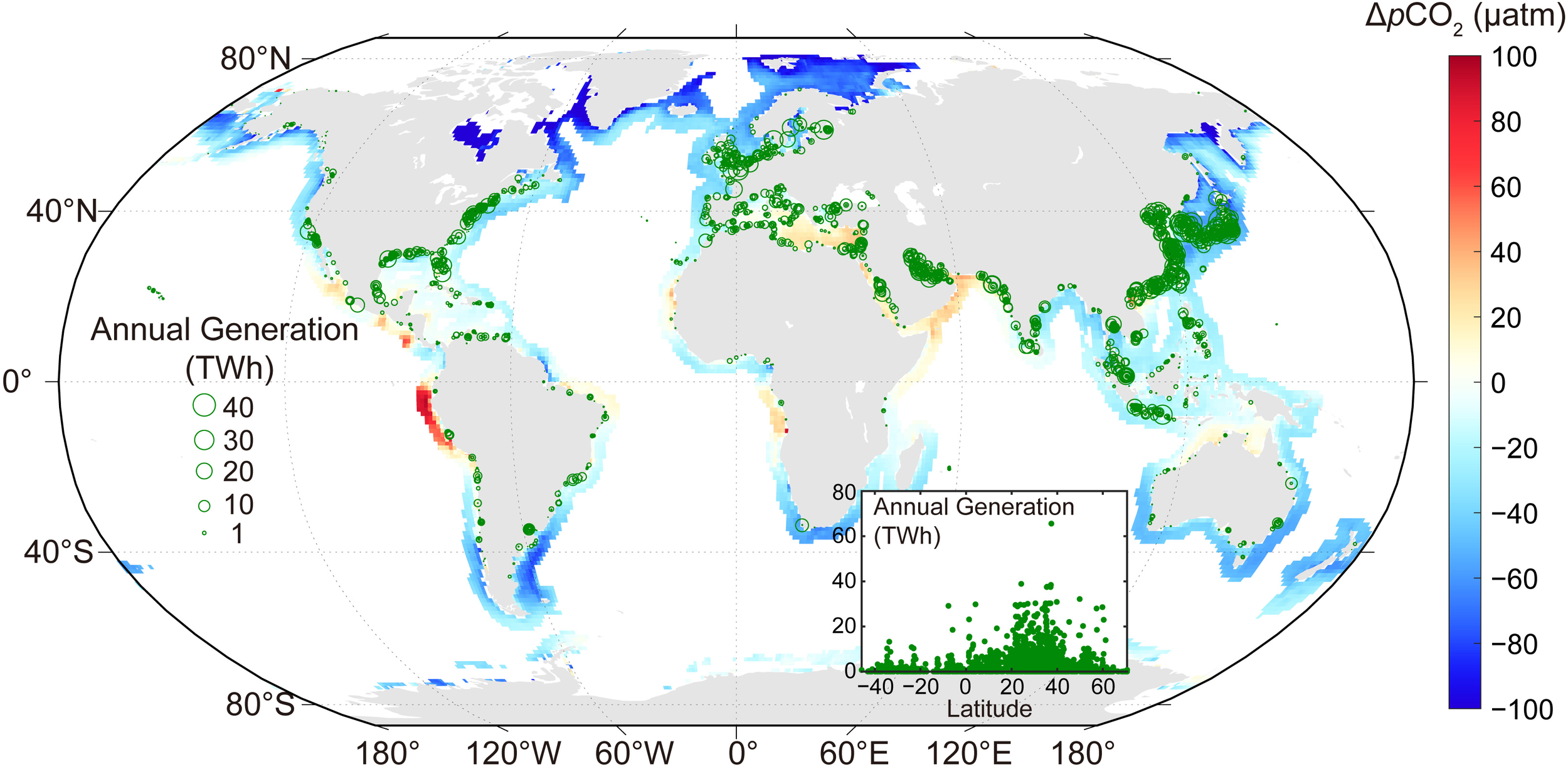Global distribution of thermoelectric power plants and their electricity generation (green circles) within 20 km of the coastline. The color bar indicates the annual mean difference between seawater and atmospheric CO2 partial pressure (ΔpCO2: seawater pCO2 – atmospheric pCO2) of the study region. An atmospheric pCO2 of 407 μatm is used, which is the 2017 average from flask analysis data collected at Mauna Loa, USA (19.54°N, 155.58°W) and obtained from the National Oceanic and Atmospheric Administration (NOAA)/Global Monitoring Laboratory (https://gml.noaa.gov/ccgg/; lastly accessed on 2 January 2024). The inset shows the latitudinal distribution of the annual electricity generation (TWh) of the coastal thermoelectric power plants.