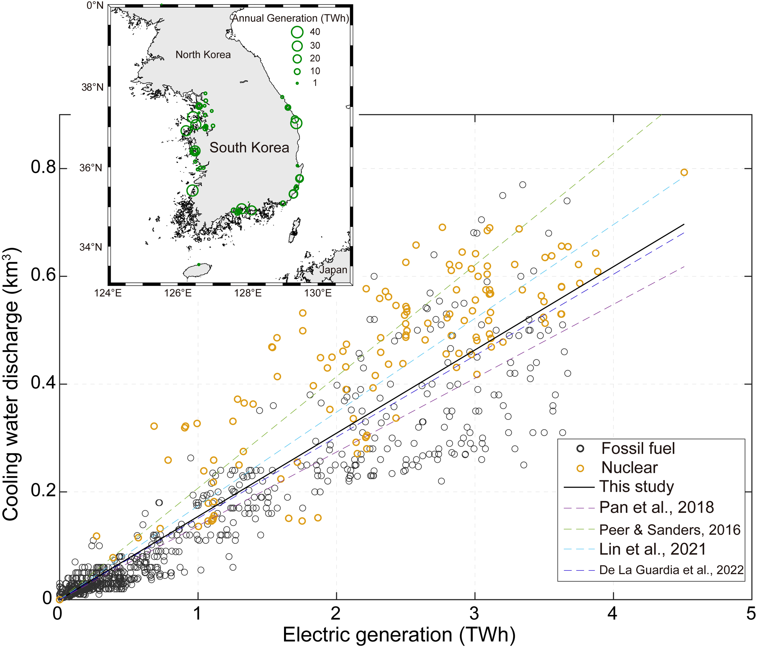 Monthly cooling water discharge (km3) versus monthly electric generation (TWh) for 22 fossil (black circles) and 5 nuclear (yellow circles) power plants in South Korea. The water use intensity is estimated to be 0.156 km3 TWh−1 (solid line), which is consistent with the range reported by previous regional studies (0.136–0.207 km3 TWh−1; dashed lines) for once-through cooling systems in fossil fuel and nuclear power plants (Peer & Sanders, 2016; Pan et al., 2018; Lin et al., 2021; De La Guardia et al., 2022). The inset shows the locations and annual electricity generation (TWh) for power plants in South Korea obtained from the Global Power Plant Database V1.3.0 (https://datasets.wri.org/dataset/globalpowerplantdatabase; lastly accessed on 2 January 2024).
