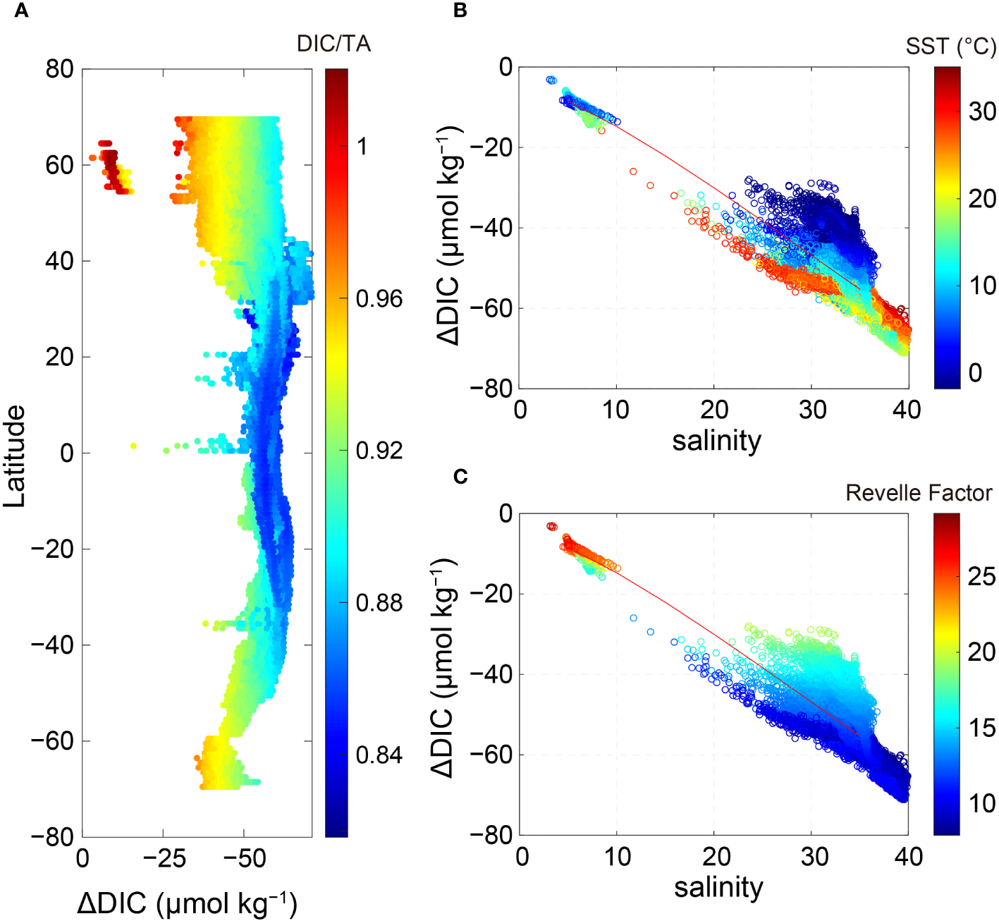 (A) Potential decrease in the total dissolved inorganic carbon (ΔDIC) of discharged cooling water. It represents the relaxation of the elevated pCO2 to original conditions solely through air–sea CO2 exchange, without accounting for other physical factors like mixed layer depth and warming period. Please note that the x-axis is reversed. Plots of ΔDIC and salinity are overlaid with the (B) SST and (C) Revelle factor. The red line in (B, C) represents the expected ΔDIC value resulting from a discharge of the assumed source water. The total alkalinity (TA) of the source water was calculated using the linear TA–salinity relationship (TA = 50.43×salinity + 548.7), which was derived from monthly TA and salinity data for coastal oceans (OceanSODA-ETHZ; Gregor & Gruber, 2021). It was assumed that the source water for cooling is initially equilibrated with atmospheric CO2.