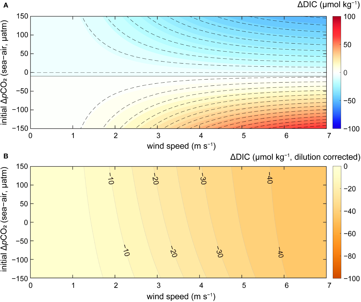 (A) The change in total dissolved inorganic carbon (ΔDIC) for both source water (dashed line) and the cooling water (indicated by color-contour) resulting from air–sea CO2 exchange at a mixed layer depth of 15 m over 6 months. The initial condition of source water corresponds to pCO2 values of 257–557 μatm and the average value of TA = 2248 μmol kg−1, S = 33.7, and T = 17.1°C. It was assumed that the cooling water is instantaneously diluted 10-fold after being discharged, resulting in a temperature increase of 0.66°C. (B) The difference in DIC concentration (cooling water – source water) represents the effect of the enhanced CO2 outgassing or weakened CO2 uptake, which varies based on the initial pCO2 levels. It is noted that ΔDIC in (B) is multiplied by a factor of 10 to account for the dilution.