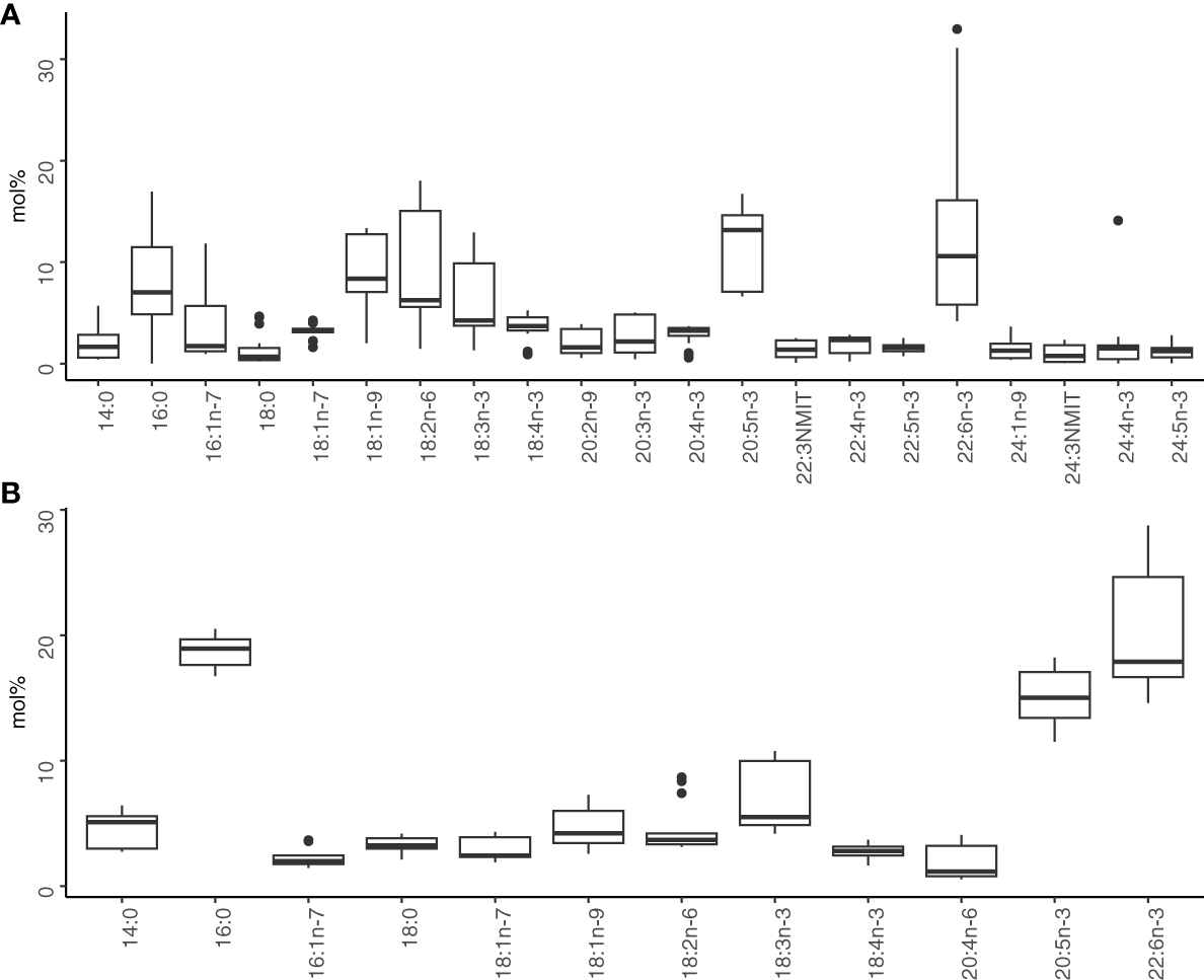 Climate change-induced warming is challenging marine ecosystems globally by decreasing the availability of polyunsaturated fatty acids (PUFAs) from dietary lipids (Tan et al., 2022). The two physiologically most important PUFAs to all marine consumers are docosahexaenoic acid (22:6n-3, DHA) and eicosapentaenoic acid (20:5n-3, EPA). Both DHA and EPA are essential for lipid-protein interactions of cell membranes and therefore, all cellular functions (Lee et al., 2006; Parrish, 2013). Fatty acids synthesized by autotrophs often remain unchanged in food webs and thus, serve as dietary markers: 16:1n-7 and EPA are considered as markers for diatoms, and 18:4n-3 and DHA as markers for dinoflagellates (Dalsgaard et al., 2003). Fatty acids can also be used for indicating trophic level in the marine ecosystem. For instance, the ratio of 18:1n-7 to 18:1n-9 is considered as a marker for omnivory, while ratio of EPA to DHA typically decreases in higher trophic levels due to accumulation of DHA (Dalsgaard et al., 2003). Finally, nutritional quality of fatty acids profiles are interpreted from high ratios of n-3 to n-6 PUFAs and unsaturated (UFA) to saturated (SFA) fatty acids (Tan et al., 2022).