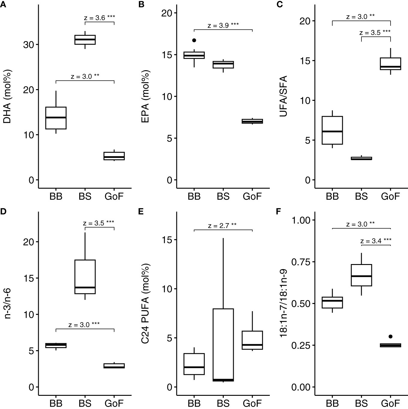 Fatty acid trophic markers (A) 22:6n-3 (DHA), (B) 20:5n-3 (EPA), (C) ratio of unsaturated to saturated fatty acids (UFA/SFA), (D) ratio of n-3 to n-6 polyunsaturated fatty acids (PUFAs), (E) C24 PUFAs and (F) ratio of 18:1n-7 to 18:1n-9 in Limnocalanus samples. Post-hoc test for Kruskal-Wallis, Dunn test, was used. The z-value shows the difference between the mean rank of a group and the mean rank of all observations. UFA/SFA, ratio of unsaturated to saturated fatty acids. P-values: 0.05 = *, <0.01 = **, <0.001 = ***.