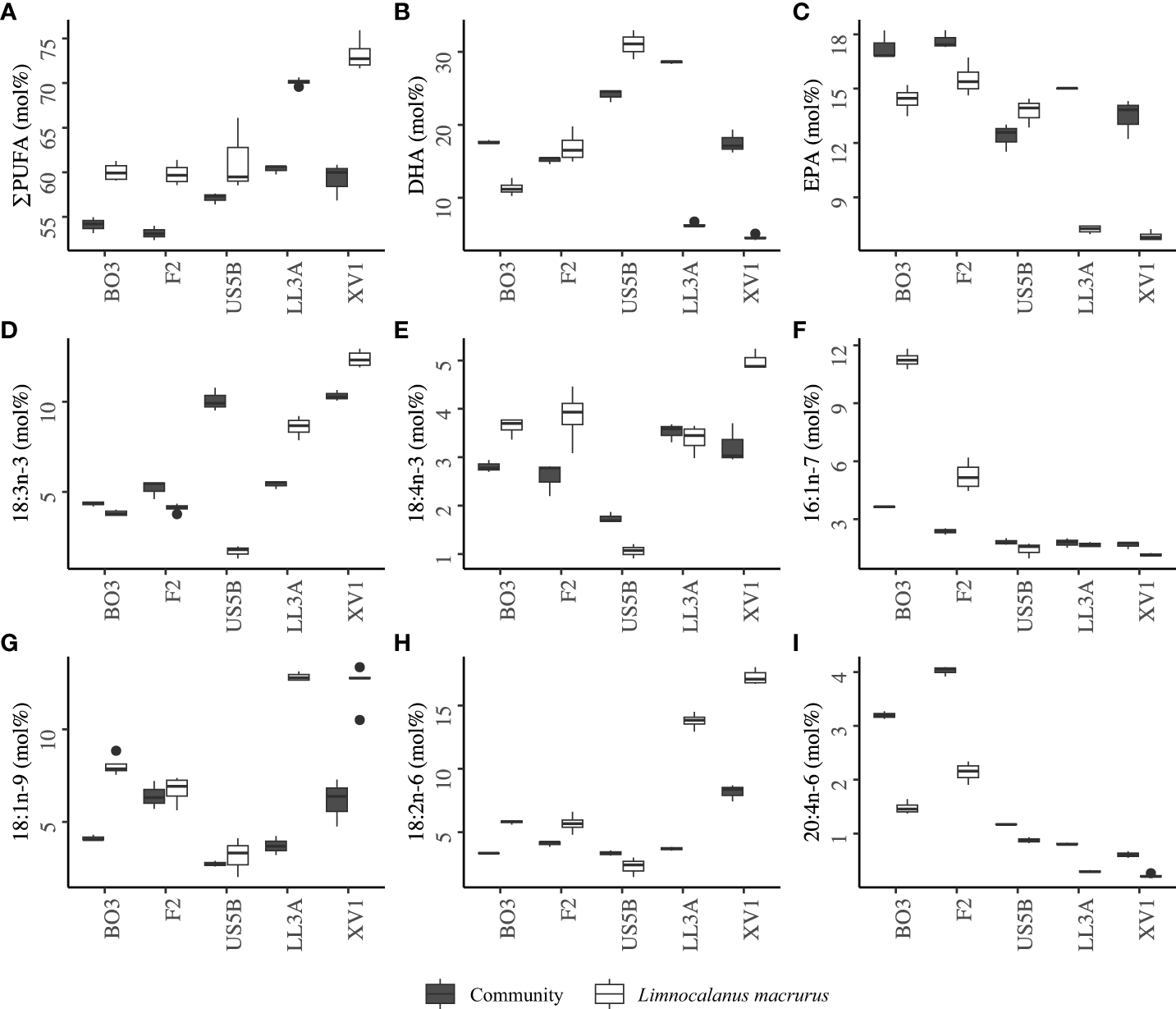 Mean mol% of fatty acid trophic markers in the plankton community and Limnocalanus macrurus: (A) sum of polyunsaturated fatty acids (PUFA), (B) 22:6n-3 (DHA), (C) 20:5n-3 (EPA), (D) 18:3n-3, (E) 18:4n-3, (F) 16:1n-7, (G) 18:1n-9, (H) 18:2n-6, and (I) 20:4n-6.