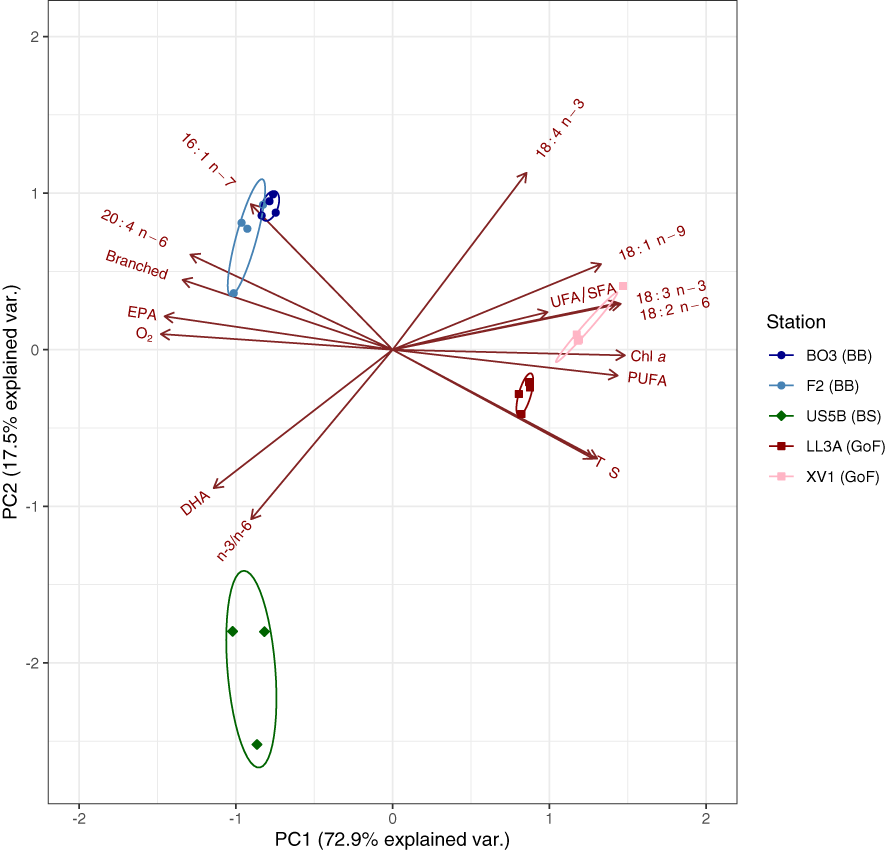 Principal component analysis (PCA) was run using the prcomp function in R, where the variables were scaled to unit variance and centered to zero. These variables included environmental variables (temperature, salinity and dissolved oxygen at 40 m, and chl a at 5 m) and selected fatty acid variables: ΣPUFA, DHA, EPA, 18:3n-3, 18:4n-3, 16:1n-7,18:1n-9, 18:2n-6, 20:4n-6, and Σbranched. L. macrurus was expected to dwell in deeper water columns; in order to compare stations, 40 m depth was chosen for comparing temperature, salinity, and dissolved oxygen between stations. However, the chl a concentration was selected from the depth with maximum chl a (5 m) to represent the eutrophication level of the sampling site; it is worth noting that L. macrurus usually dwell below the productive layer. The plot was created using ggbiplot package (Vu, 2011).