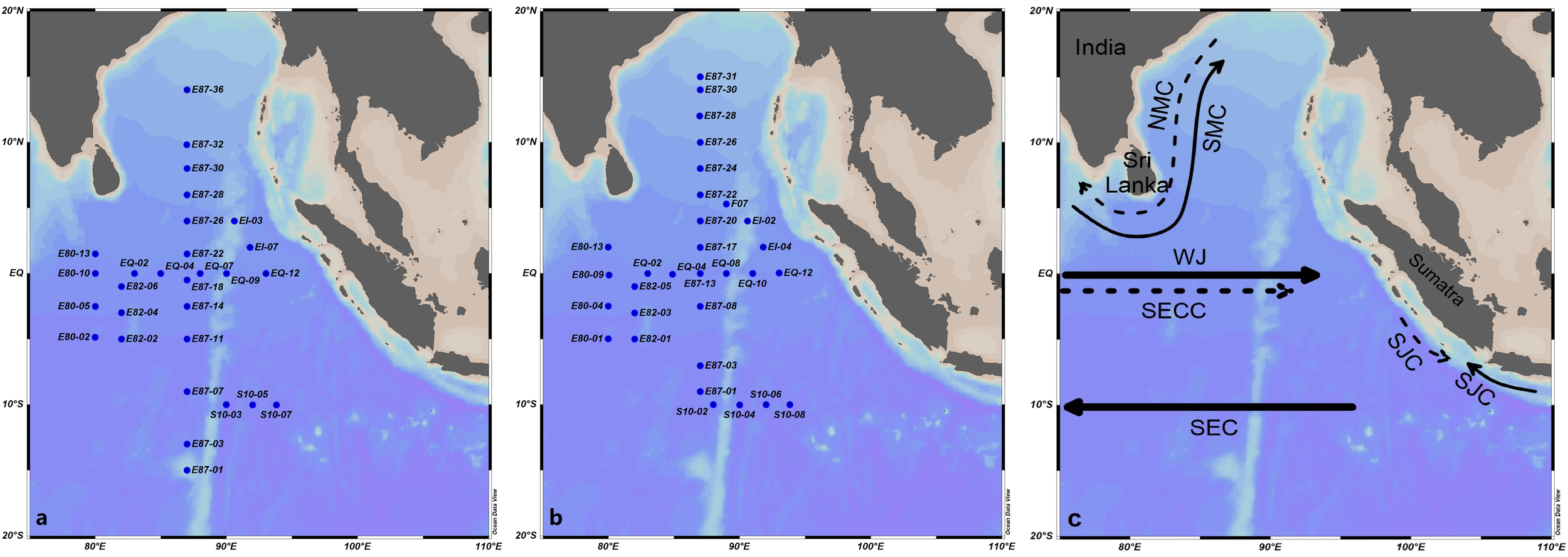 Despite several national or international programs, including the Joint Global Ocean Flux Study (JGOFS), World Ocean Circulation Experiment (WOCE), and the NOAA Ocean–Atmosphere Carbon Exchange Study (OACES), proceeding across the world oceans since the 1990s (Sabine et al., 2000; Key et al., 2004; Bates et al., 2006), the distributions of inorganic carbon parameters and their controlling processes in the EIO, as well as the role of the EIO in the global carbon cycle, have been largely neglected compared to those in the Pacific and Atlantic oceans (Feely et al., 2006; Bates, 2007; Sutton et al., 2017; Cai et al., 2020; Curbelo-Hernández et al., 2021). In addition to these programs, Xue et al. (2014) recently reported partial pressure of carbon dioxide (pCO2) data collected in the eastern equatorial Indian Ocean (5°N–5°S, 90–95°E), Sarma et al. (2015; 2018) studied the controlling factors of dissolved inorganic carbon (DIC) and the sources and sinks of CO2 along the west coast of the BoB during the 2010s, and Sarma et al. (2023a) evaluated the contributions of chromophoric dissolved organic matter to DIC as organic alkalinity (Alk) through the investigation of 18 Indian estuaries. Furthermore, other studies in this region have been conducted based on model results, which may not sufficiently reflect the actual situation and thereby require additional observational data to support the conclusions reached (Joshi et al., 2020; Chakraborty et al., 2021). Therefore, additional observational efforts are essential to effectively monitor carbonate system parameters.