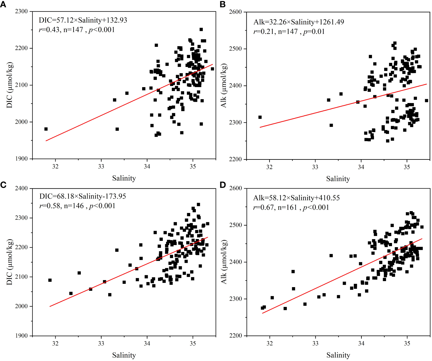 Relationship between DIC and Alk vs. salinity during autumn 2020 (DIC: A; Alk: B) and spring 2021(DIC: C; Alk: D).