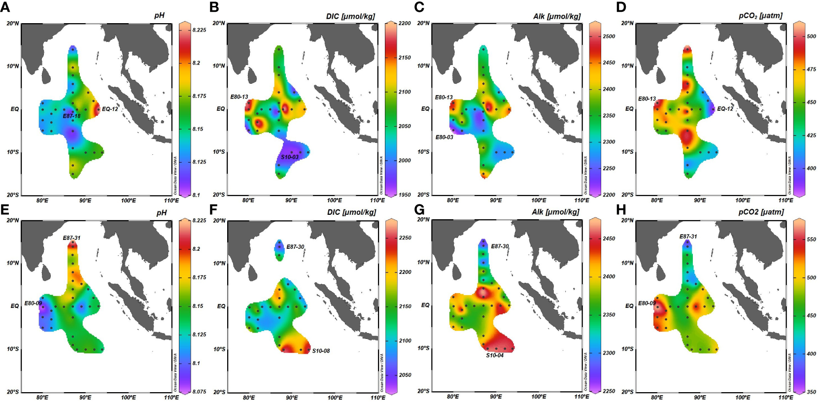 The pH of the surface seawater of the EIO during spring ranged from 8.08 to 8.22 with an average value of 8.14. The pH generally decreased from north to south and presented high values in the BoB (maximum at station E87-31) and low values in the west of the study area (minimum at station E80-09). The values of DIC and Alk were in the ranges of 2,044–2,251 and 2,274–2,460 µmol kg−1, with averages of 2,140 and 2,390 µmol kg−1, respectively. Both DIC and Alk showed low values in the BoB (minima at station E87-30), which was again opposite to the pattern observed for pH. High values were observed in the southernmost of the study area: the maximum DIC at station S10-08 and the maximum Alk at station S10-04. pCO2 varied from 372 to 572 µatm, with a mean of 478 µatm. pCO2 increased from north to south with the maximum observed at station E80-09 and the minimum observed at station E87-31, which was again exactly opposite to the pH distribution pattern (Figure 3).