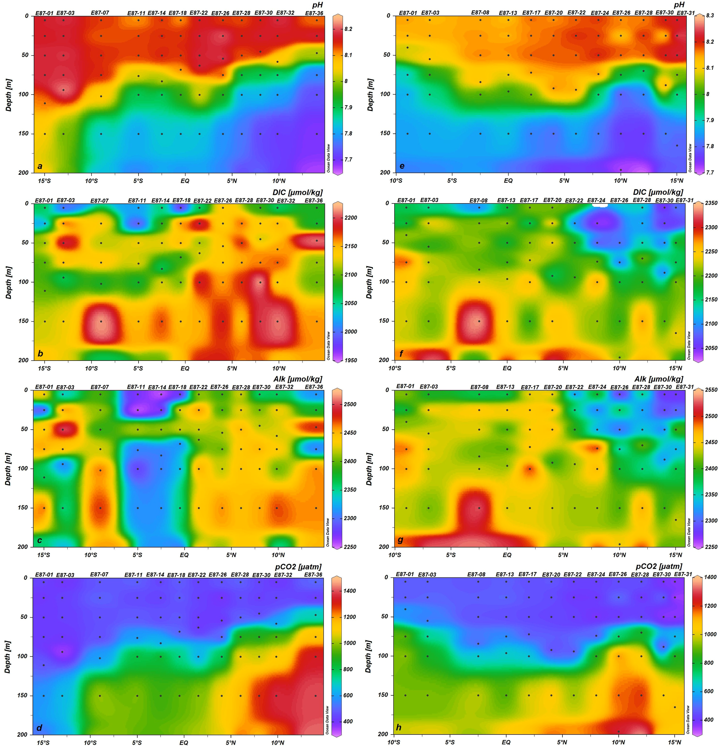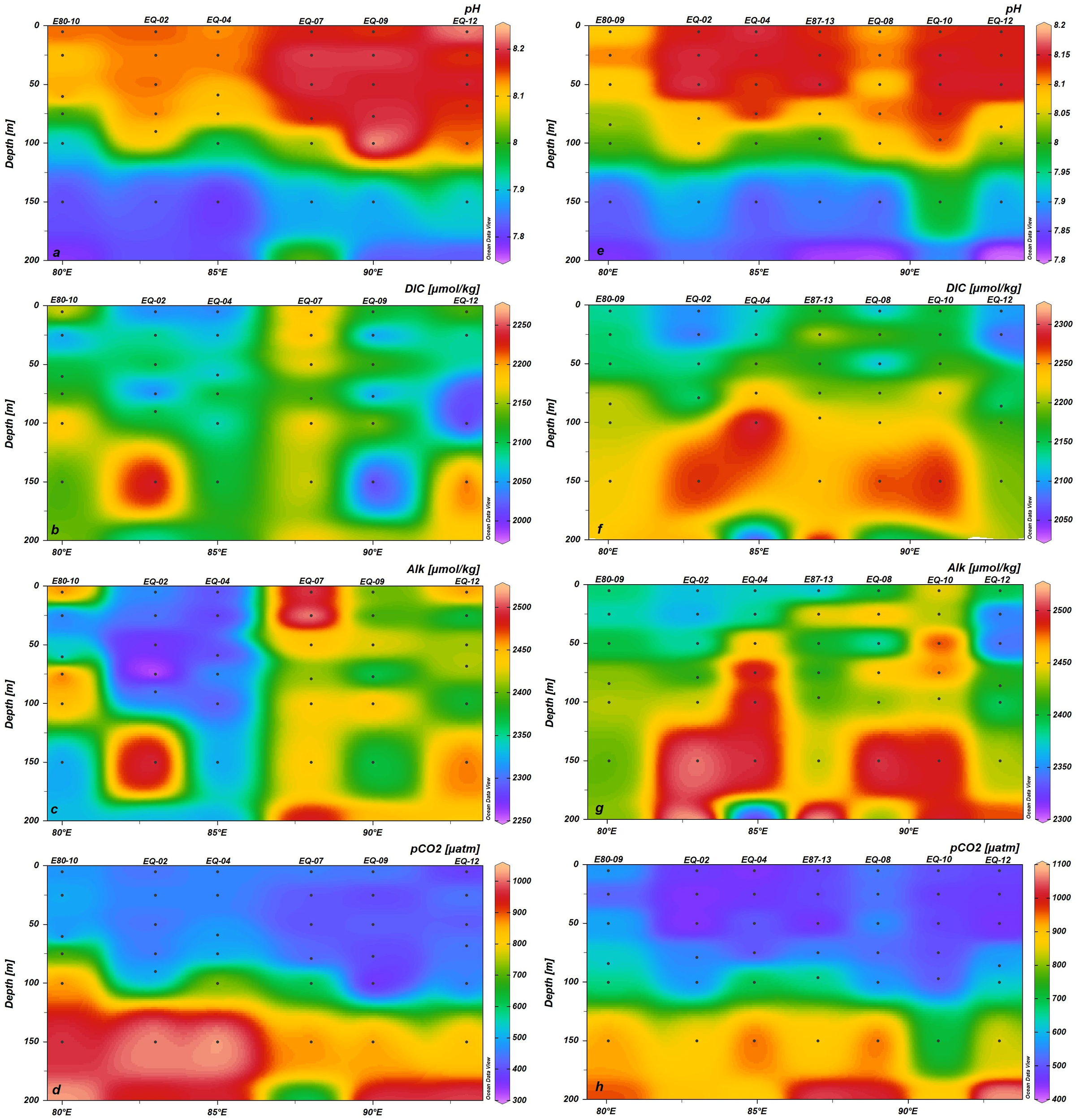 Vertical profiles of pH, DIC, Alk, and pCO2 in the upper 200 m at transect EQ of the EIO during autumn 2020 (A–D) and spring 2021 (E–H).