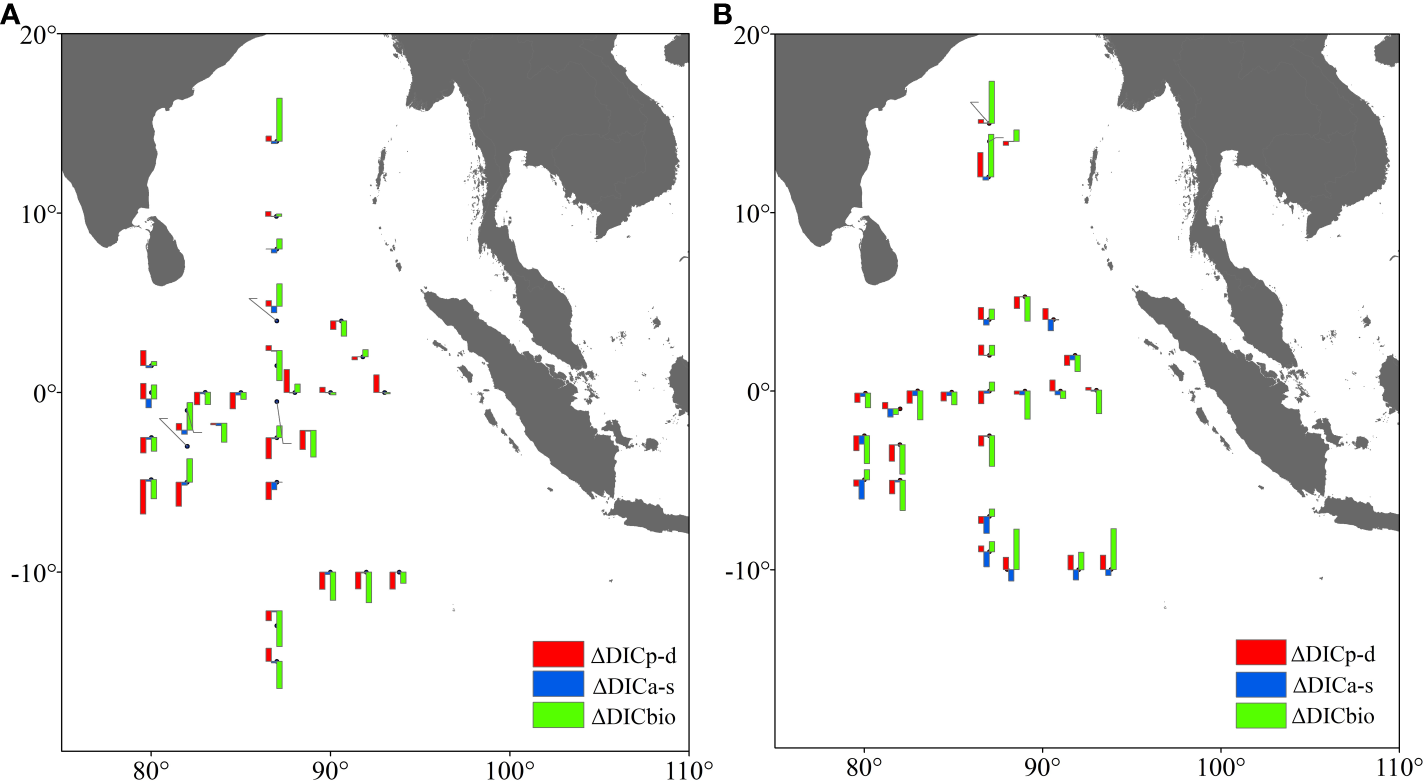 where ΔDICp-d, ΔDICbio, and ΔDICa-s represent DIC changes caused by CaCO3 precipitation–dissolution, biological, and sea–air exchange processes, respectively; ΔAlkp-d and ΔAlkbio represent Alk changes caused by the processes of CaCO3 precipitation–dissolution and biological processes, respectively; and −17/106 × ΔDICbio is the expected Alk change during the biological use or release of DIC assuming the Redfield ratio (Redfield et al., 1963). Considering that the change in Alk from biological processes is relatively minor compared to changes in DIC, the biological term was ignored in practice according to previous studies (Xue et al., 2016; Li et al., 2022; Zhang and Hu, 2023).