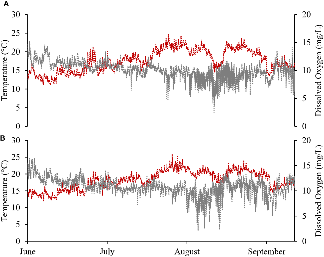 Continuous temperature (red-dashed line) and dissolved oxygen (grey-dashed line) data for deep-water sites at (A) Deep Bay and (B) Denman Island farms in Year 2 (June−September 2022).