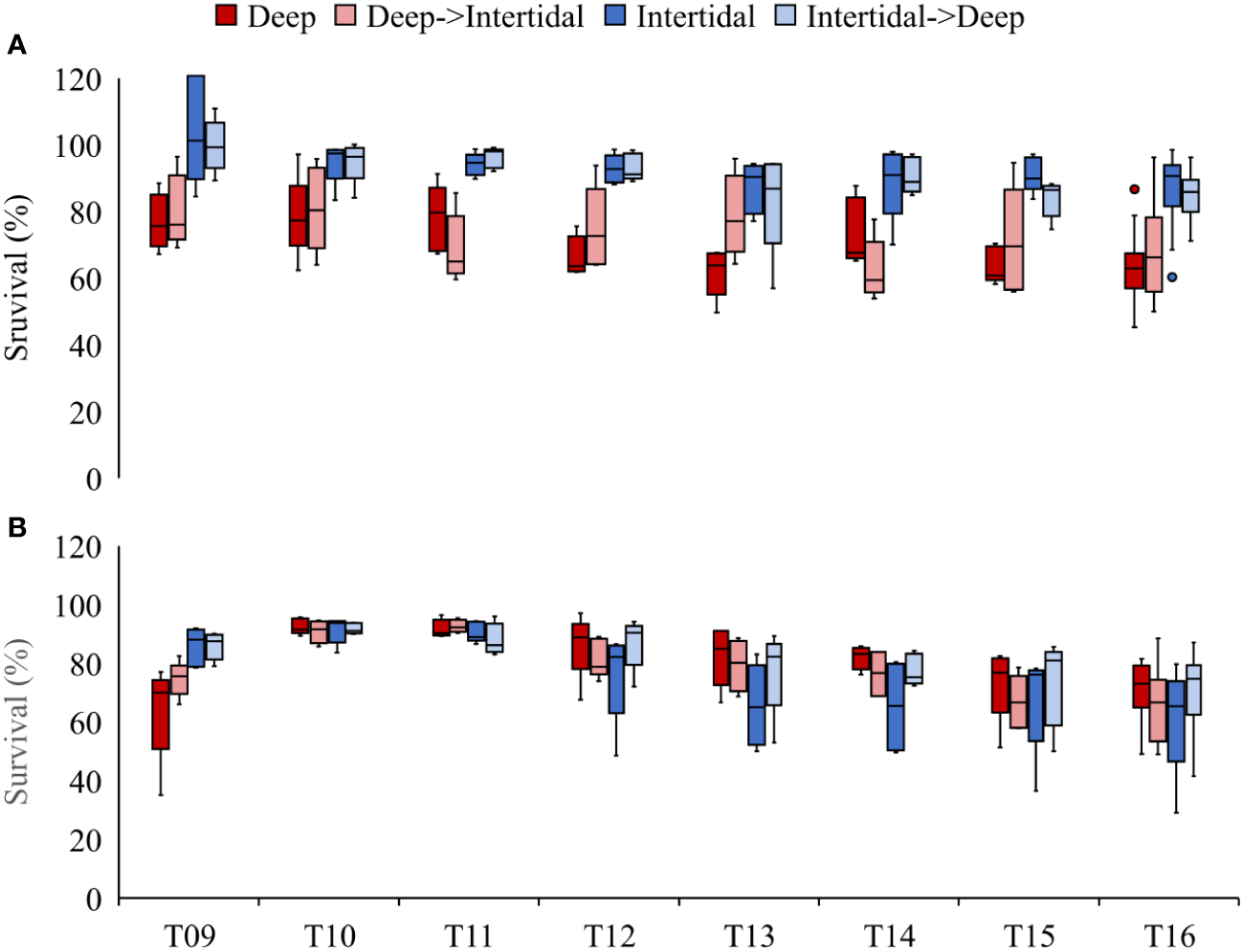 Box plots of survival (%) in Deep (dark red), Deep→Intertidal (light red), Intertidal (dark blue), and Intertidal→Deep (light blue) treatments at (A) Deep Bay and (B) Denman Island farms in Year 2 (T09−T16). T09 = late May, T10 = late June, T11 = early July, T12 = late July, T13 = early August, T14 = late August, T15 = mid-September, and T16 = late September. Bag splitting (number of oysters per bag reduced from 250 to 100) occurred between T09 and T10.