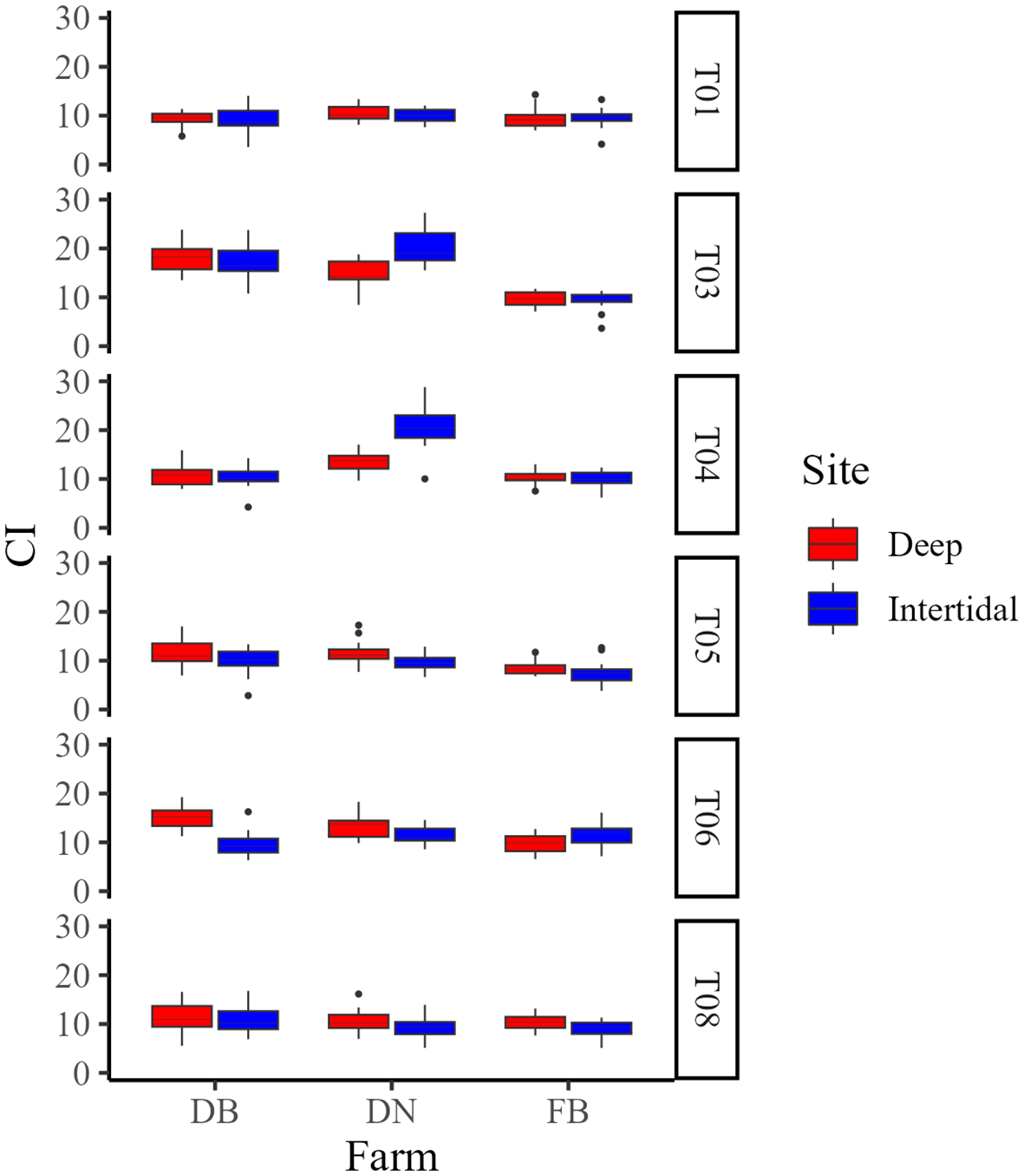 Box plots of condition index (CI) at Deep (red) and Intertidal (blue) sites at Deep Bay (DB), Denman Island (DN), and Fanny Bay (FB) farms in Year 1 (T01−T08). T01 = early May, T03 = early June, T04 = late June, T05 = early July, T06 = late July, and T08 = late August. T02 and T07 are not shown as no samples were collected due to logistical constraints.