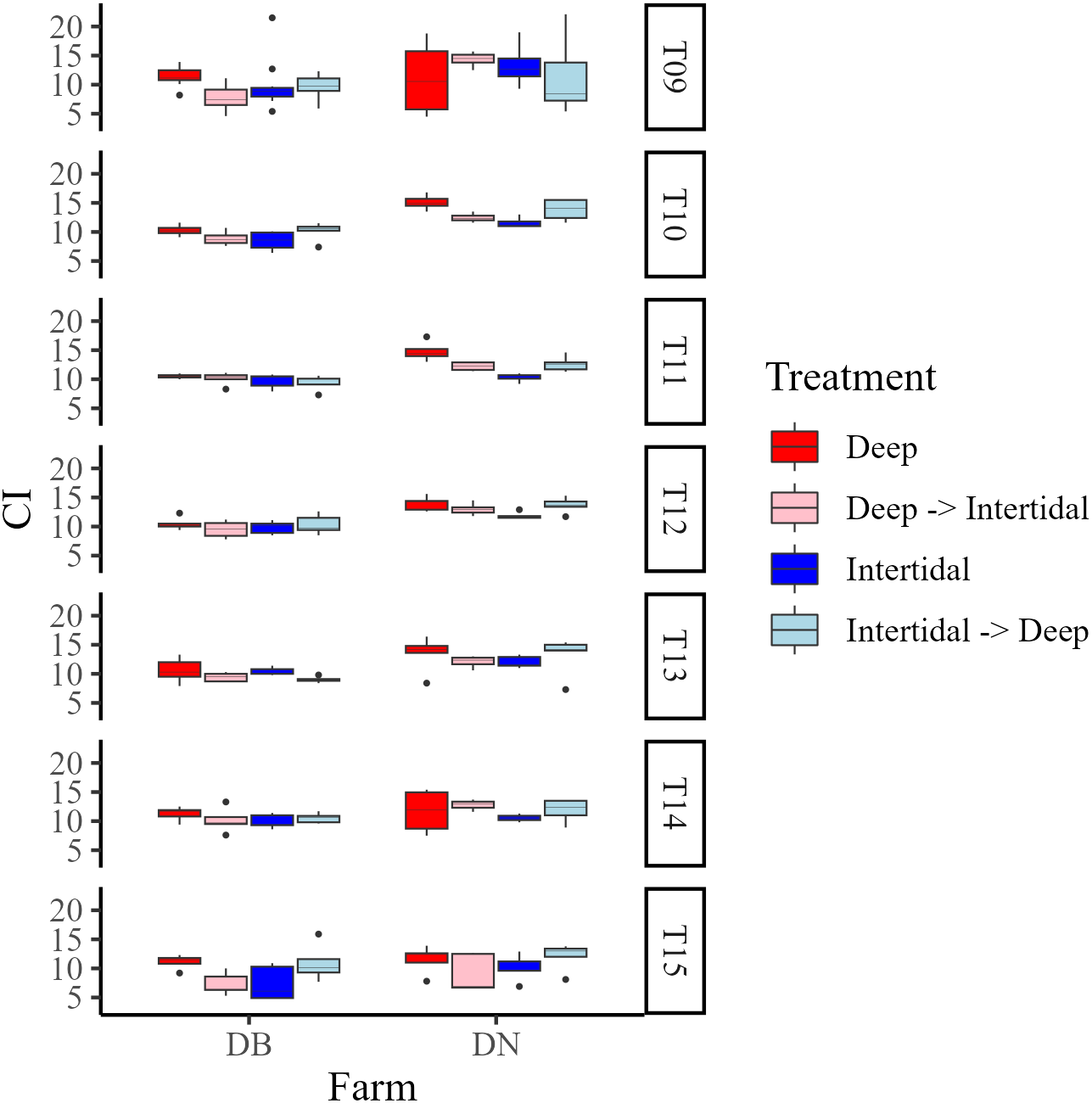 Box plots of condition index (CI) at Deep (dark red), Deep→Intertidal (light red), Intertidal (dark blue), and Intertidal→Deep (light blue) treatments at Deep Bay (DB) and Denman Island (DN) farms in Year 2 (T09−T15). T09 = late May, T10 = late June, T11 = early July, T12 = late July, T13 = early August, T14 = late August, and T15 = mid-September.