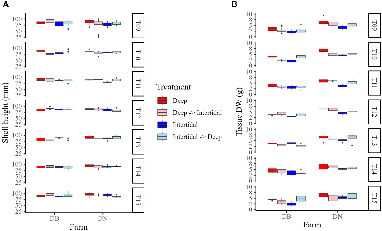 In Year 2, mean shell heights at the end of the field trial (T15) in Deep, Deep→Intertidal, Intertidal, and Intertidal→Deep treatment groups at each farm were 90.34 ± 6.88 mm, 94.66 ± 5.76 mm, 86.68 ± 3.03 mm, and 94.60 ± 9.28 mm (DB), and 95.00 ± 8.73 mm, 93.38 ± 2.43 mm, 93.02 ± 5.67 mm, and 87.20 ± 4.77 mm (DN), respectively (Figure 9A). Mean tissue DWs for the same timepoint (T15) in Deep, Deep→Intertidal, Intertidal, and Intertidal→Deep treatment groups at each farm were 4.52 ± 1.07 g, 3.37 ± 1.45 g, 2.43 ± 1.01 g, and 4.75 ± 1.46 g (DB), and 6.18 ± 2.28 g, 5.06 ± 1.88 g, 5.44 ± 1.74 g, and 6.16 ± 1.73 g (DN), respectively (Figure 9B).