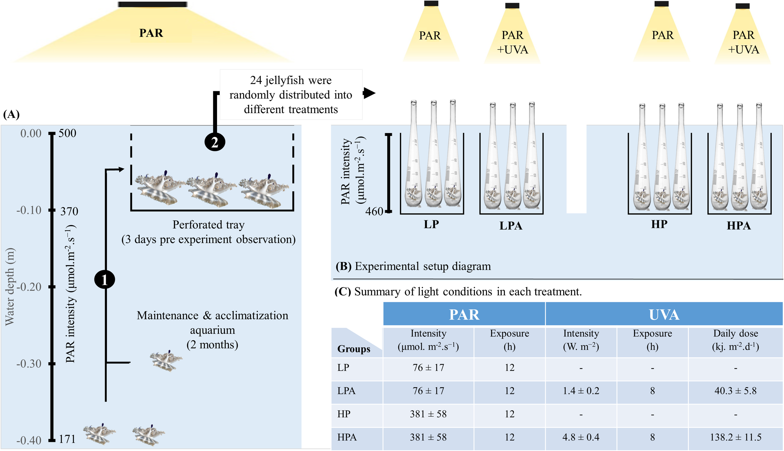 Cassiopea demonstrates significant resilience to various environmental factors like elevated temperatures, pollution and UVB exposure (Aljbour et al., 2017, 2018, 2019, 2023). However, few studies have examined the cellular and physiological effects of UVA on this jellyfish, with only one detailed investigation to date (Aljbour et al., 2023). Where the authors studied UVA in combination with UVB and not UVA alone. They concluded that UVA had no effect on jellyfish physiology or development following their exposure to UVB. They also discovered that UVB (± UVA) caused greater cellular respiration in jellyfish. Klein et al. (2016) found that UVB has a deleterious impact on the health and survival of Cassiopea polyps. According to Banaszak and Trench (1995), UVR exposure increased MAA synthesis in symbiotic Cassiopea. However, previous research did not provide clear information on the biological significance of UVA (Banaszak and Trench, 1995; Klein et al., 2016; Aljbour et al., 2023). Therefore, in the present study, we analyzed the impact of varying PAR and UVA levels on the metabolism, oxidative stress responses, and physiological performance of jellyfish. We investigated the influence of UVA on jellyfish responses, including survival, growth, aerobic respiration, chlorophyll-a content, and LPO, while considering the varying effects of high and low PAR intensities. In addition, we explored the role of PAR intensity as an independent factor affecting jellyfish performance. We conducted experiments by exposing jellyfish to four distinct light conditions: low PAR (LP), low PAR + UVA (LPLA), high PAR (HP), and high PAR + UVA (HPHA). This is the first comprehensive study to investigate the differential roles of UVA in mediating cellular responses of Cassiopea sp. under varying light conditions. The findings of this study are expected to provide valuable insights into the biology and ecology of this jellyfish, shedding light on its responses to environmental variations and potential implications for marine ecosystems.