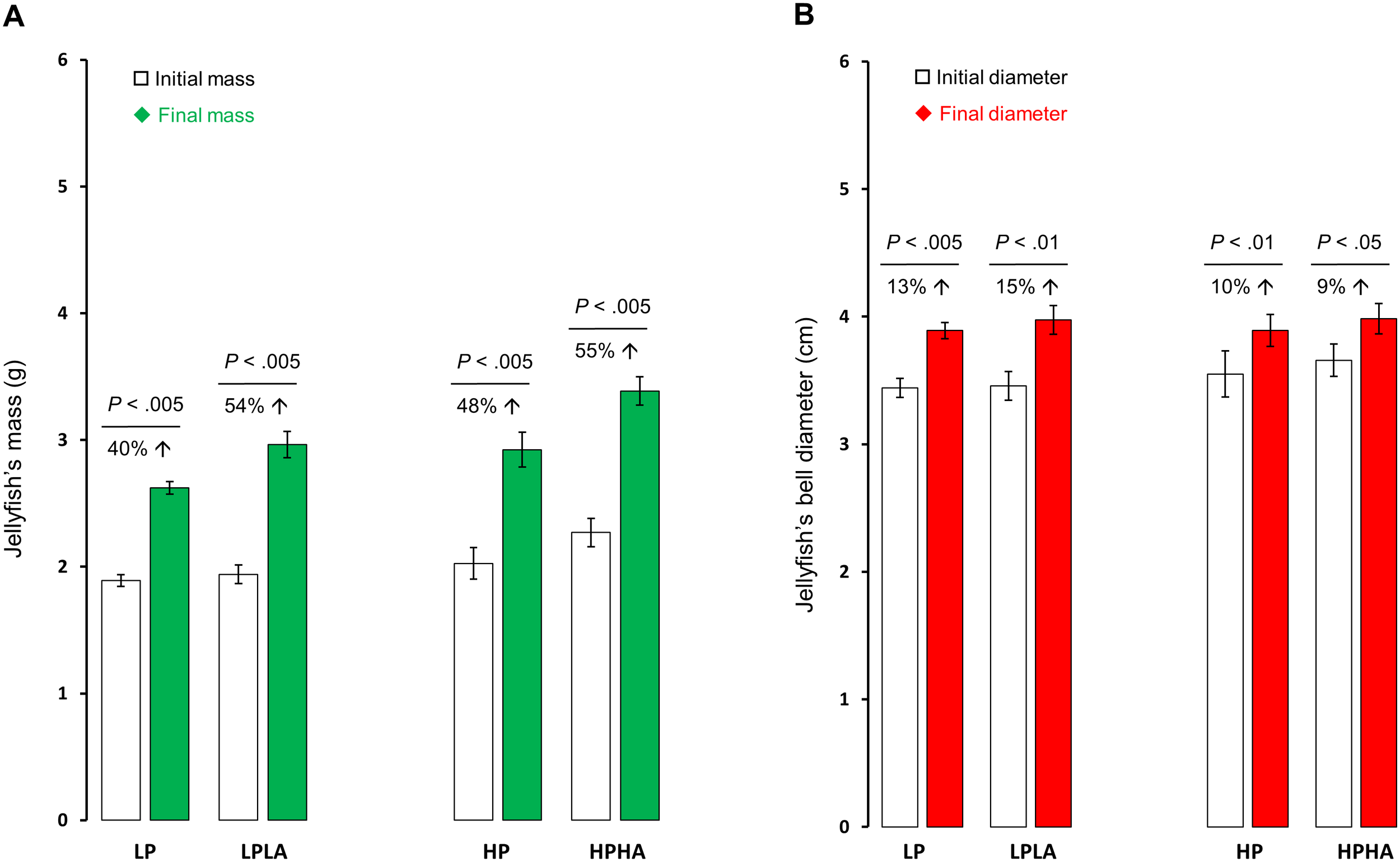 Medusae mass and bell diameter changes pre and post exposure to PAR and UVA. Panel (A) displays alterations in the average mass in grams, whereas (B) illustrates changes in the average bell diameter in centimeters. We conducted paired t-tests to analyze the data. The percent increase and the corresponding p-value from the t-test are indicated above the bars. The bars in the graph depict the mean, and the error bars represent the standard error of the mean. Each group had a sample size of 6. LP: low PAR (−UVA), LPLA: low PAR (+UVA), HP: high PAR (−UVA), and HPHA: high PAR (+UVA).