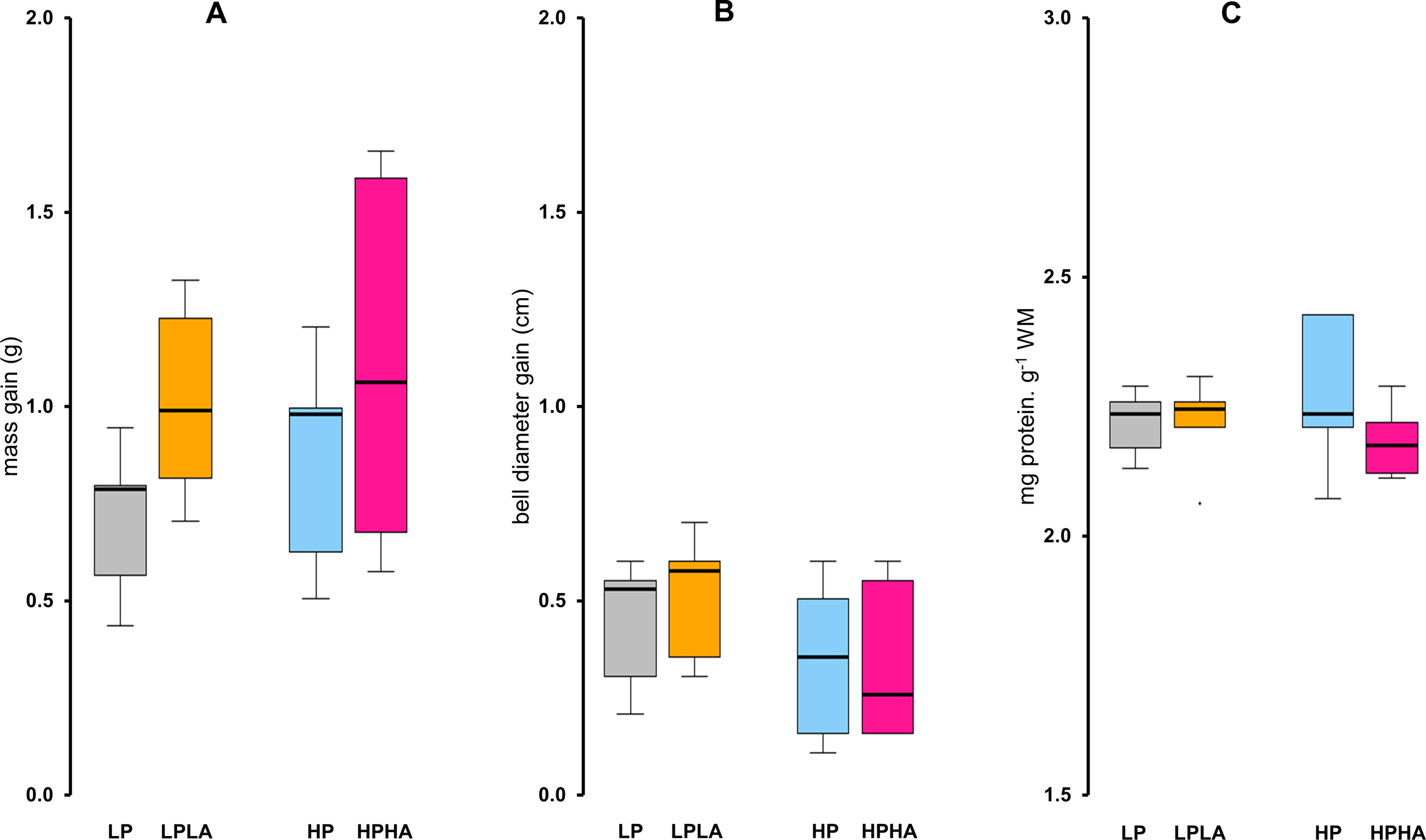 Effects of varying PAR and UVA intensities on the mass, bell diameter, and total protein content of Cassiopea medusae. (A) displays the increase in mass in grams, and (B) illustrates the increase in bell diameter in centimeters. The increase in these parameters was determined by subtracting the initial values from the final values. (C) displays the total protein content. Each group had a sample size of 6. One-Way ANOVA and Tukey’s multiple comparison tests revealed no significant differences among any of the groups. The box represents the interquartile range (IQR), with a line at the median. Whiskers extend to 1.5 times the IQR, and points outside this range are considered outliers. LP: low PAR (−UVA), LPLA: low PAR (+UVA), HP: high PAR (−UVA), and HPHA: high PAR (+UVA).