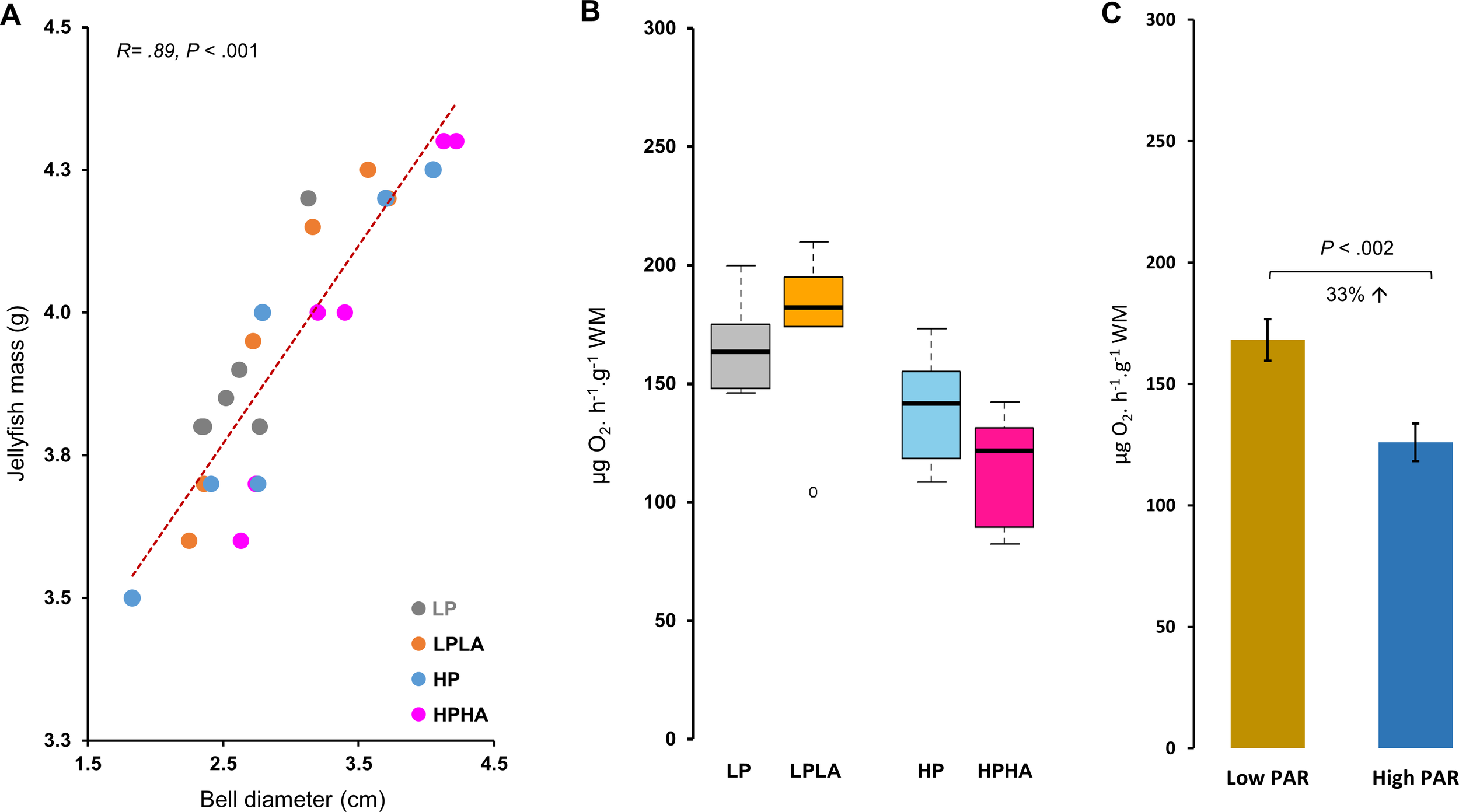 Correlation between the mass and bell diameter of jellyfish and cellular respiration in Cassiopea medusae under PAR and UVA. In (A), the correlation between the final wet mass and bell diameter was analyzed using Pearson’s correlation test (N = 24). (B) presents ETS activity, a proxy for cellular respiration, with different letters above the boxes indicating statistical significance as determined by One-Way ANOVA and Tukey’s multiple comparison test. Each group had 6 jellyfish, except LPLA with 5 after removing an outlier. (C) depicts ETS activity in the low and high PAR groups. LP: low PAR (−UVA), LPLA: low PAR (+UVA), HP: high PAR (−UVA), and HPHA: high PAR (+UVA).