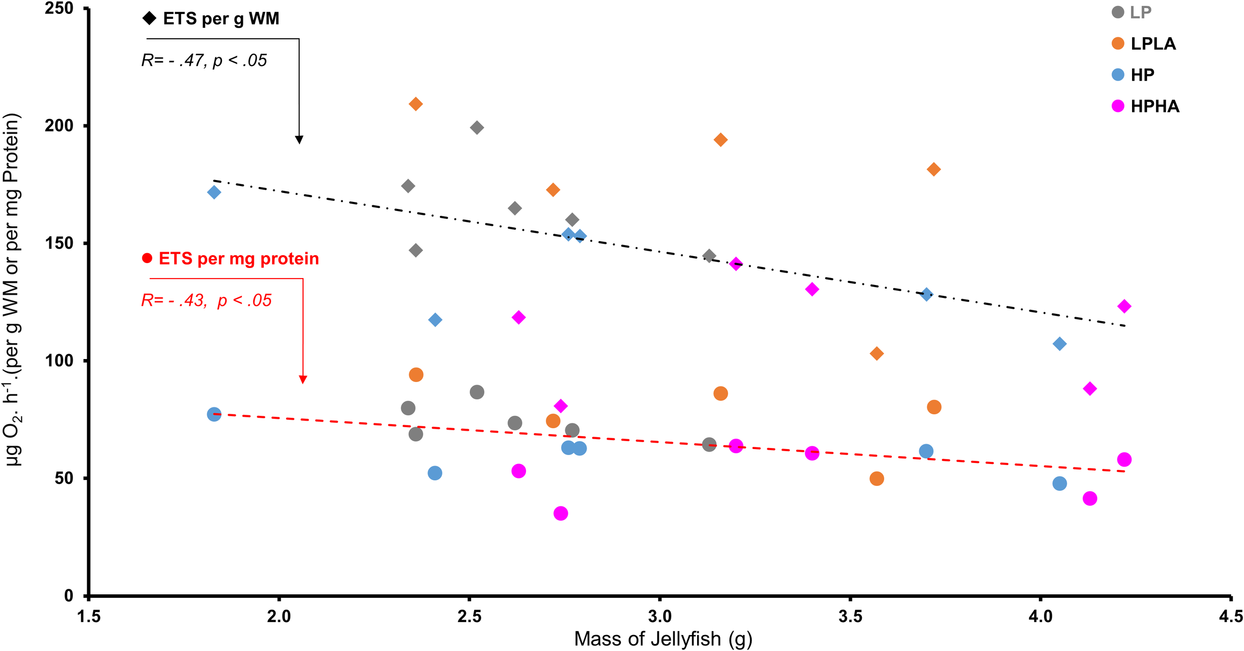 ETS activity differed significantly among the groups (One-Way ANOVA: F(3, 19) = 5.28, p = .008; Figure 5B). Tukey’s HSD post hoc tests showed that ETS activity was significantly higher in LP (by 46%, p = .022) in LPLA (52%, p = .012) compared to HPHA. No other comparisons were significant (p >.05). Overall, ETS activity was 33% higher in the low PAR treatment (LP and LPLA combined) than in the high PAR treatment (HP and HPHA combined) (Welch two-sample t-test: t(20.23) = 3.57, p = .002; Figure 5C). Pearson’s correlation analysis revealed a significant negative correlation between ETS activity and jellyfish mass (r(21) = −0.470, p <.05; Figure 6).