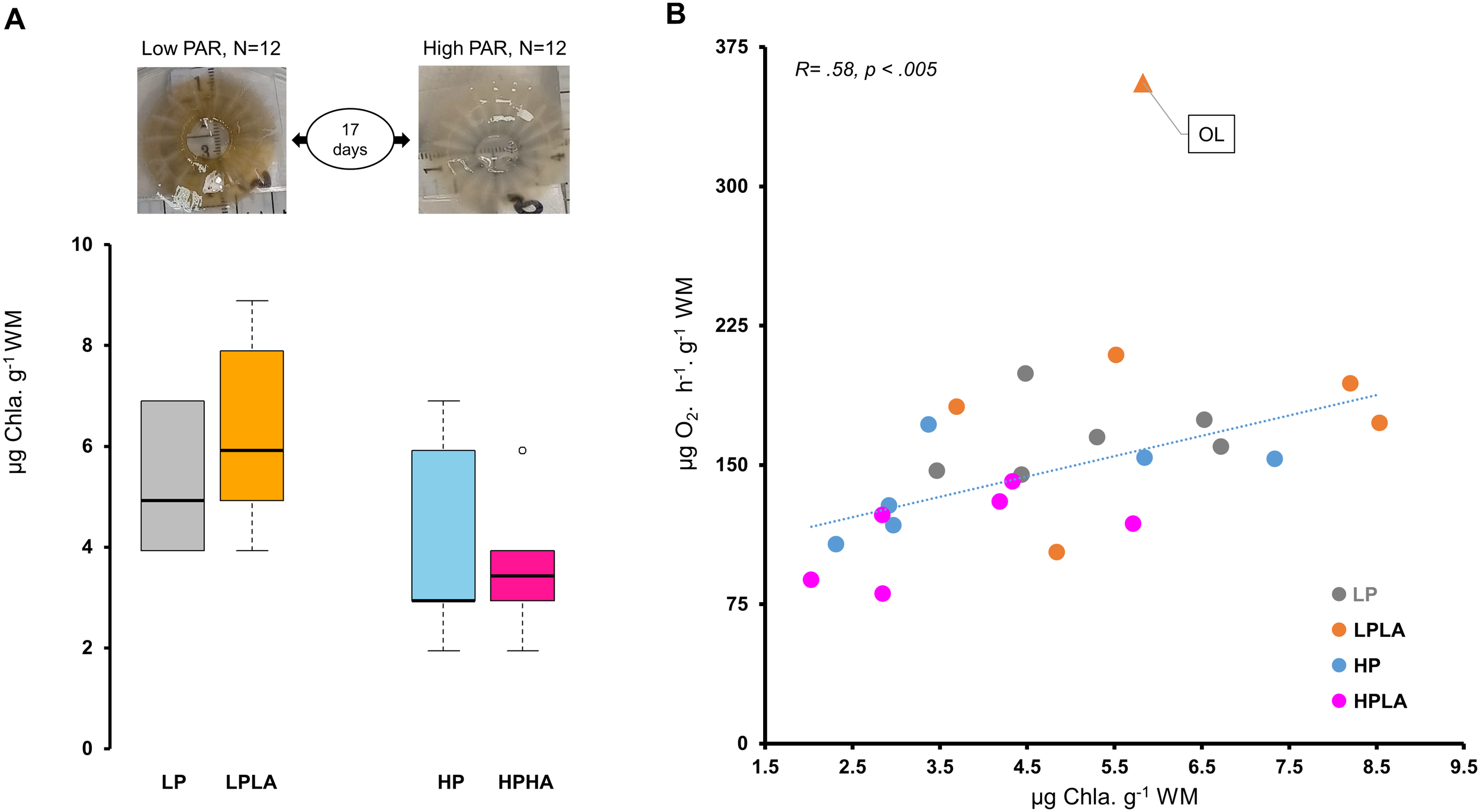 Chlorophyll-a concentration and its correlation with ETS activity in Cassiopea medusae under varying PAR and UVA conditions. (A) shows the effect of varying PAR and UVA intensities on the color and chlorophyll-a concentration in Cassiopea bells across different treatment groups. One-Way ANOVA and Tukey’s multiple comparison test found no significant differences in chlorophyll-a concentrations between the groups. (B) presents correlation between chlorophyll-a concentration and ETS activity as analyzed using Pearson’s correlation test (N = 23). To ensure unbiased findings, an outlier was removed from the ETS activity data, and its corresponding value was eliminated from the chlorophyll-a dataset during the test. However, the data point is depicted on the plot and indicated by “OL” and a triangle symbol (▲). LP: low PAR (−UVA), LPLA: low PAR (+UVA), HP: high PAR (−UVA), and HPHA: high PAR (+UVA).