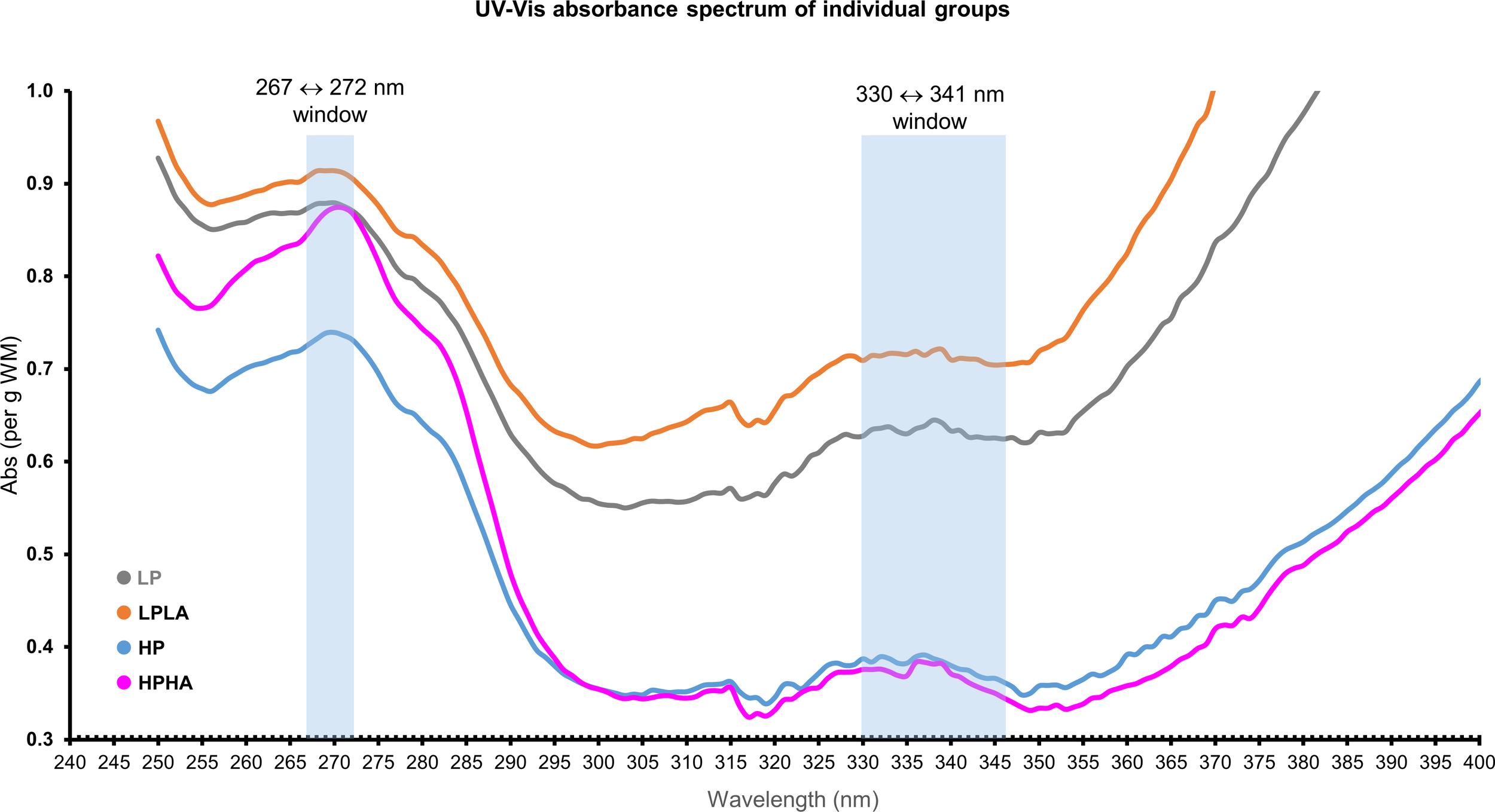 Jellyfish exposed to low PAR (i.e., LP and LPLA) appeared darker in color compared to those exposed to high PAR (i.e., HP and HPHA), which appeared brighter (Figure 7A). All groups showed similar absorbance spectra in the 250–400 nm wavelength range (Figure 9). However, the magnitudes of absorption were not identical across the experimental groups. Jellyfish samples exhibited two absorption peaks in the UVR region: one in the 330–341 nm range, corresponding to MAA absorption peaks, and another in the 267–272 nm range, within the ultraviolet C region.