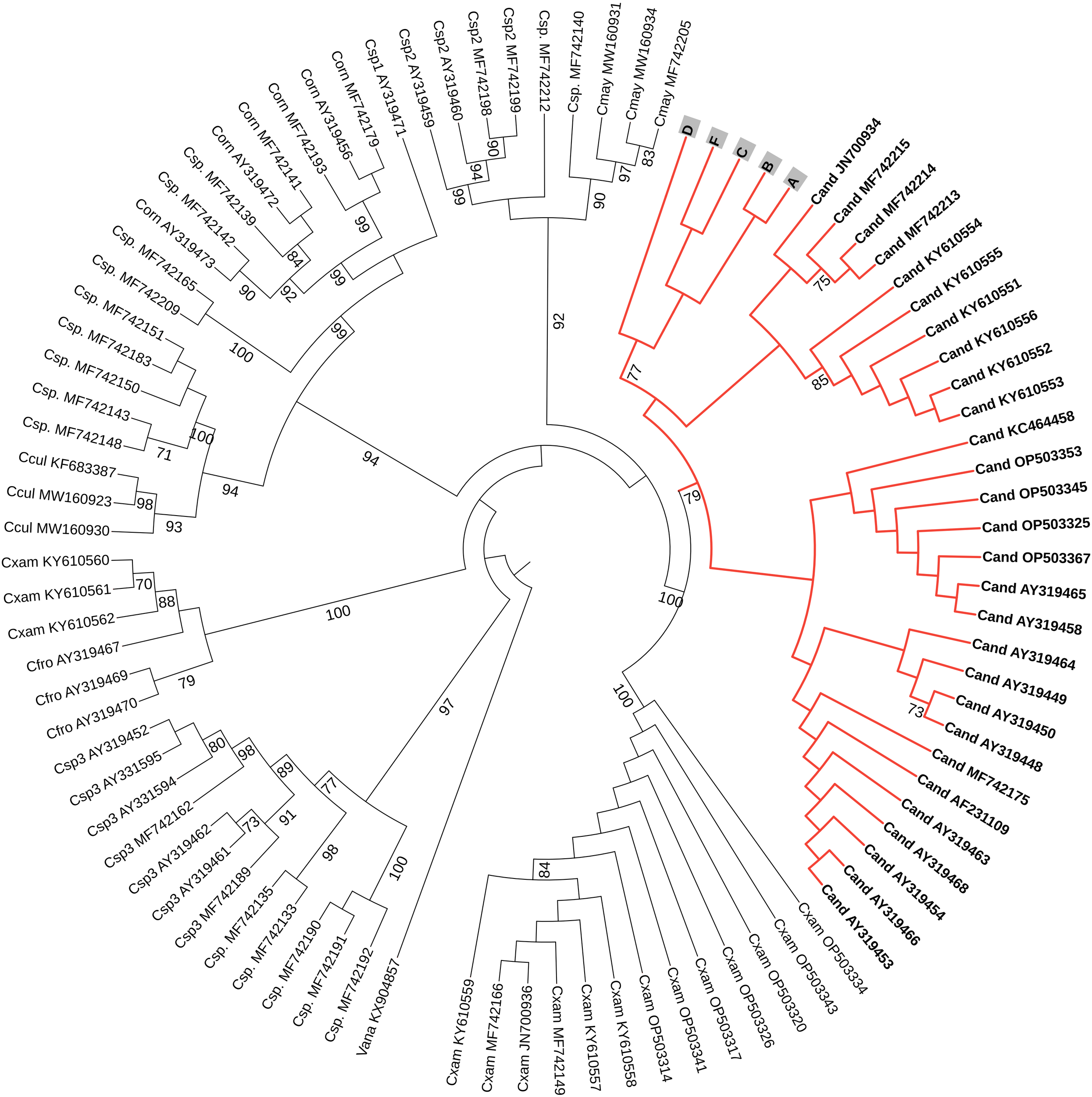 A circular phylogenetic tree, based on COI sequences, depicts the relationships among major Cassiopea jellyfish species. Bootstrap values < 70 were not shown to avoid bulkiness of the tree. At the tip of each branch, the names (abbreviated with the first letter of the genus and the first three letters of the species) and accession numbers are displayed. Cand: Cassiopea andromeda, Cxam: Cassiopea xamachana, Cmay: Cassiopea mayeri, Ccul: Cassiopea culionensis, Cfro: Cassiopea frondosa, Corn: Cassiopea ornata, Csp.: Cassiopea sp., Csp1: Cassiopea sp. 1, Csp2: Cassiopea sp. 2, Csp3: Cassiopea sp. 3, and Vana stands for Versurga anadyomene (an outgroup). The letters A, B, C, D, and F represent the jellyfish from this current experiment. Species names were assigned according to Muffett and Miglietta (2023).