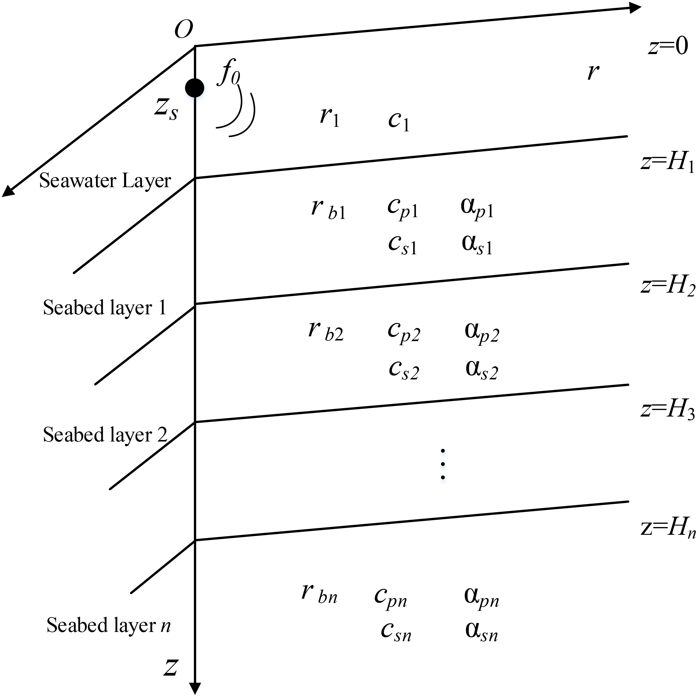 In the model, the harmonic point source is located on the symmetry axis of the cylindrical coordinate. In shallow sea waveguide environments, the characteristics of seafloor sediments play an indispensable role in influencing marine acoustic fields. Various parameters of sediment layers affect the reflection, transmission, and the paths and directions of sound wave propagation at the seabed boundary. Therefore, investigating the properties of seafloor sediments is crucial for understanding the propagation patterns of marine acoustic fields (Li et al., 2020). In this context, seawater is considered as a homogeneous isotropic fluid medium, and the seafloor sediments as an elastomeric medium. A forward modeling approach for sound field propagation in layered seabed environments is thus established, as depicted in Figure 1. Due to the axial symmetry of the column coordinate system, the three-dimensional problem can be transformed into a two-dimensional (r, z) plane for solving (Wen et al., 2021), z=0 represents the sea surface, and the downward direction of the sea surface is the positive direction of the z-axis of depth, and the positive axis of r represents the propagation direction of the sound field.
