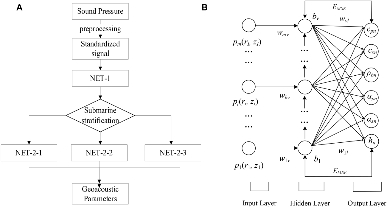 Schematic diagram of seabed stratification and parameters inversion calculation based on BPNN model: (A) Flow diagram; (B) BPNN (NET 2-1) model.