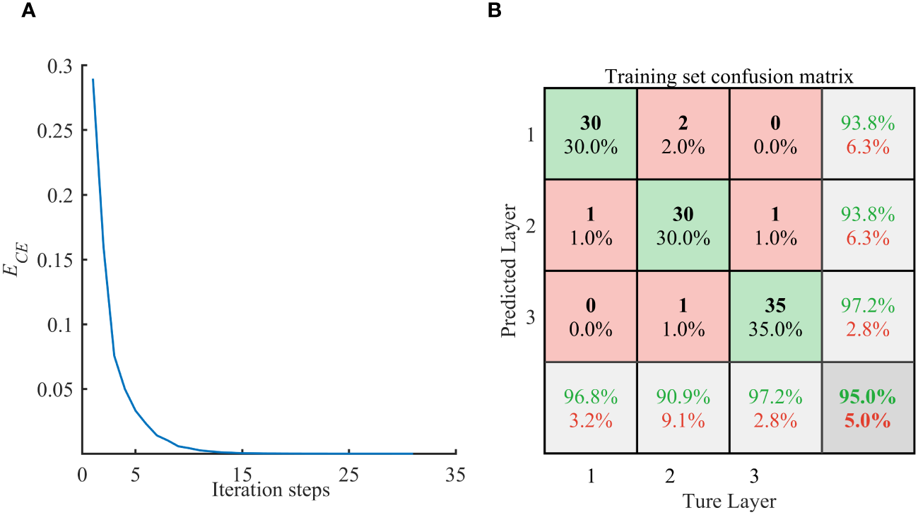 The verification set is generated using random values. The changes in loss function and prediction accuracy in the training process of NET-1 are shown in Figure 3. As can be seen from Figure 3A, after a certain batch of training, the error of the training curve is reduced to σ, the network stops training, and the confusion matrix further verifies that NET-1 also has a good classification effect on the verification data, and can complete the classification calculation of the submarine stratified structure.