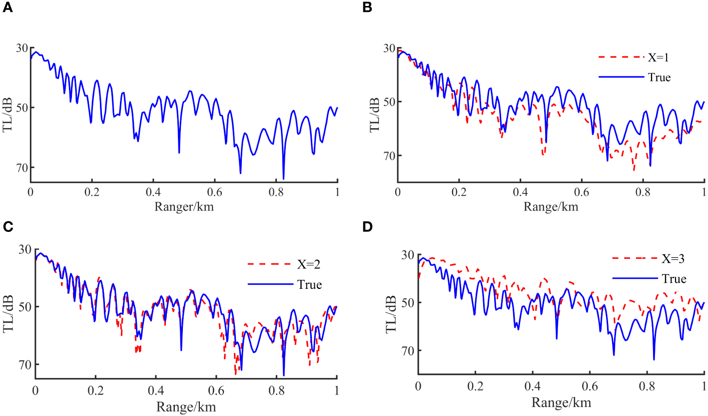 The simulated sound pressure field data is a set of horizontal equally spaced receiving sound pressure fields under the set sound source depth zs=20m, receiving depth zr=10m and seawater depth H=100m. The receiving points are spaced 2m apart, and a total of I=720 receiving points are set. The model training samples adopted by NET2-X are 2200 groups of sound pressure data randomly generated in each layer within the search range in Table 1, among which 200 groups are randomly divided into training sets and the other 200 groups into test sets. Each group (Layered structure) of the training set and its corresponding environmental sound pressure are mapped into the model one by one for training. When the error function EMSE reaches the set accuracy σ=0.01, the training is completed (Huang et al., 2018).