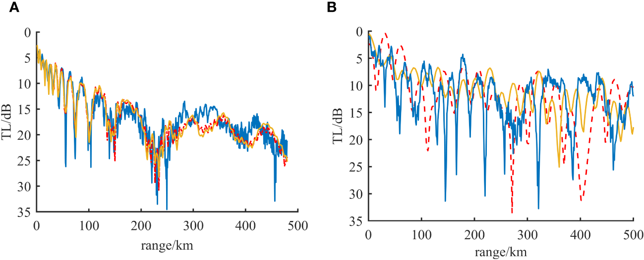 Figures 6A–F shows the ground sound parameter training results of the first sedimentary layer, and Figures 6G–K shows the ground sound parameter training results of the second sedimentary layer. As can be seen from the figure, the training effect of the first layer is better and the degree of fitting is higher. It can be seen from the literature that different parameters have different influences on acoustic propagation characteristics, especially cpn and csn have the greatest influence on acoustic field characteristics, so the accuracy of inversion results of these parameters is higher than other parameters. From the fitting degree in the training process, it can be seen that the fitting degree of cpn and csn parameters is better, which accords with the law of sound field calculation in the forward modeling model, which proves the applicability of the method.