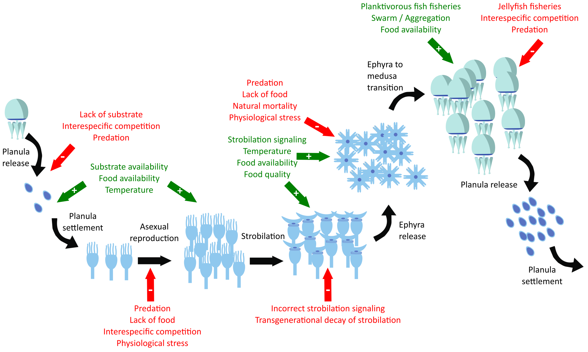 Scyphozoan life cycle (black arrows), enhancer factors (green arrows with plus sign), and limiting or inhibiting factors (red arrows with minus sign).