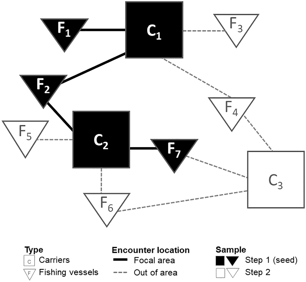Two-step sampling protocol. The image illustrates sampling protocols for Step 1 encounters (black lines) among seed vessels with black symbols and vessels identified in step 2 are represented by white symbols with encounters shown as dashed grey lines.