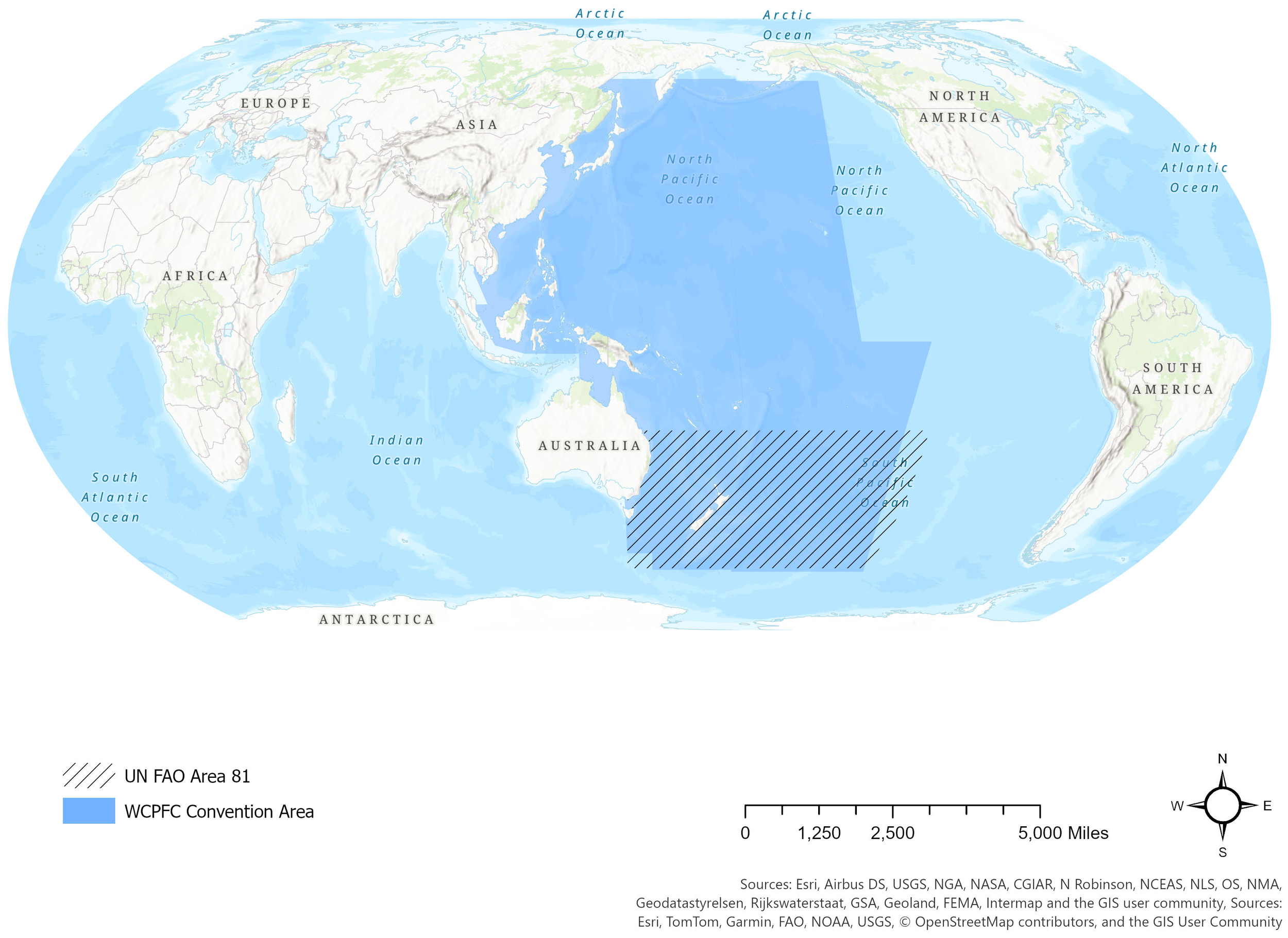 Study region. The blue region identifies the Western Central Pacific Fisheries Commission Convention area, and the hash lines depict the focal study area, UN Food and Agriculture Organization Area 81.