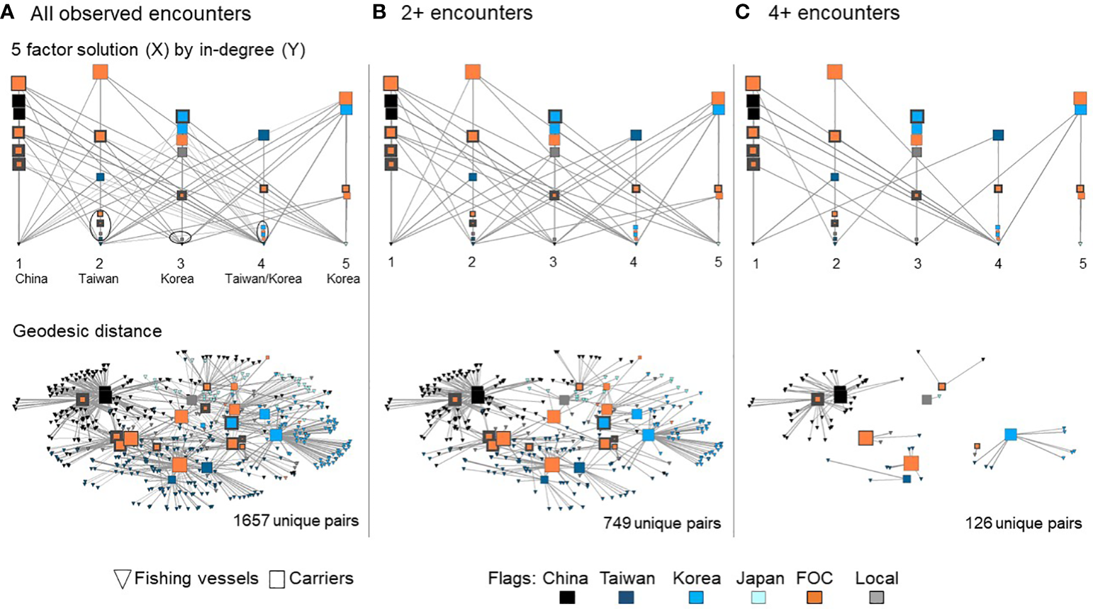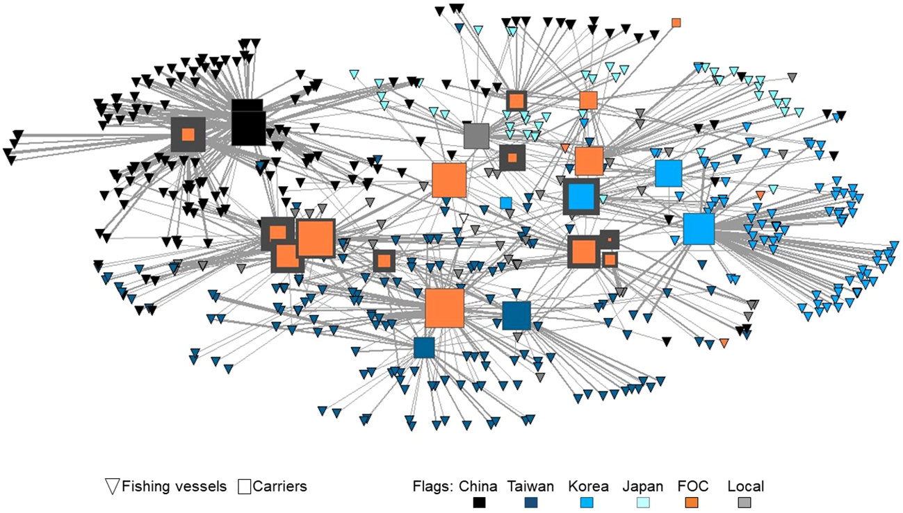 Figure 3 presents a multivariate illustration of the full encounter network. Immediately evident, refrigerated carriers differ in their centralization and level of deficiency. While FOC carriers are spread throughout the network, subgroups of vessels tend to cluster by flag; Chinese, Taiwanese and Korea fishing fleets occupy different regions of the network. Carriers appear to cluster in sectors that include at least one highly deficient vessel.