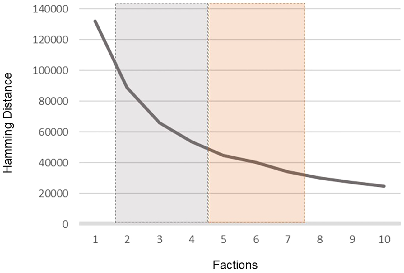 Hamming distance scores. Hamming distance scores indicate the dissimilarity between matrices. Lower values indicate more similarity. The grey region highlights large improvements in fit observed with each successive introduction of additional factions and the orange region highlights where the inclusion of additional factions does not materially improve the fitness of the solution.