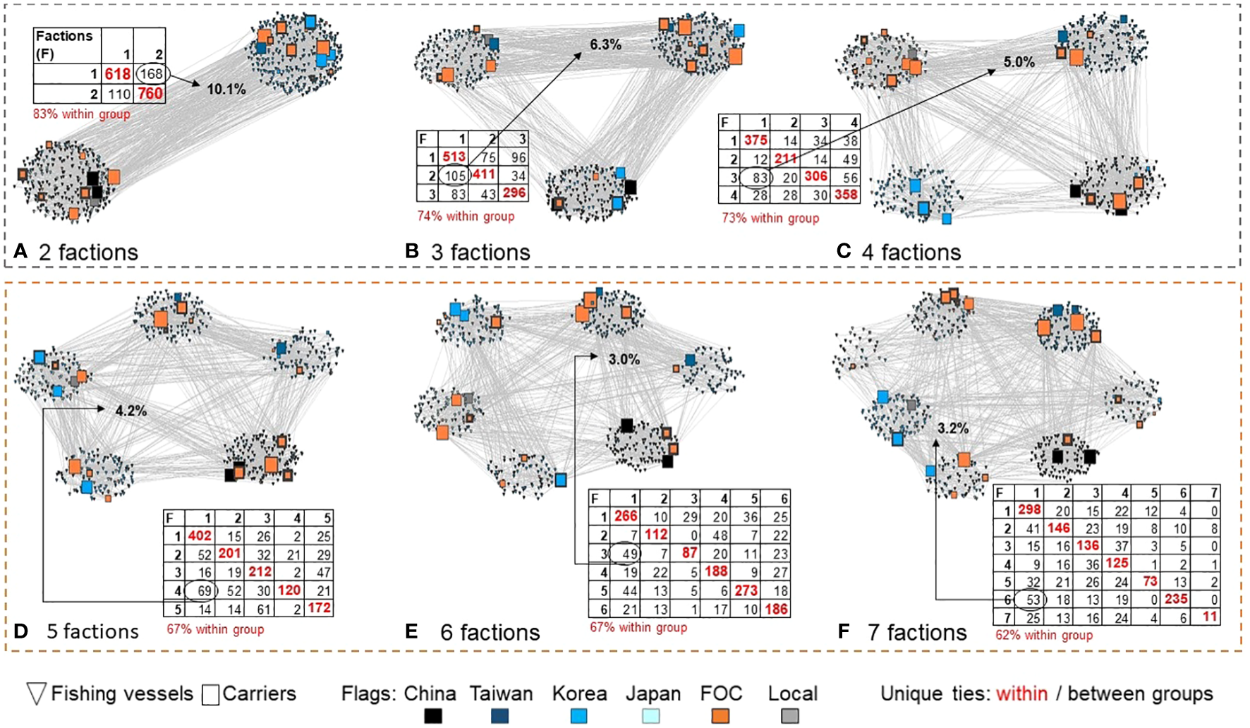 Visualization of partitions. Panels (A‐F) depict factions with symbol size indicating carrier centrality, rim variation representing defficencies, and tabular inserts reporting within- and between-faction ties. The largest set of between-group transshipments is indicated; for example, (A) the two-factor solution results in 168 at-sea encounters from fishing vessels classified as Faction 1 to carriers allocated to Faction 2. This represents 10.1% of the unique vessel pairings observed.