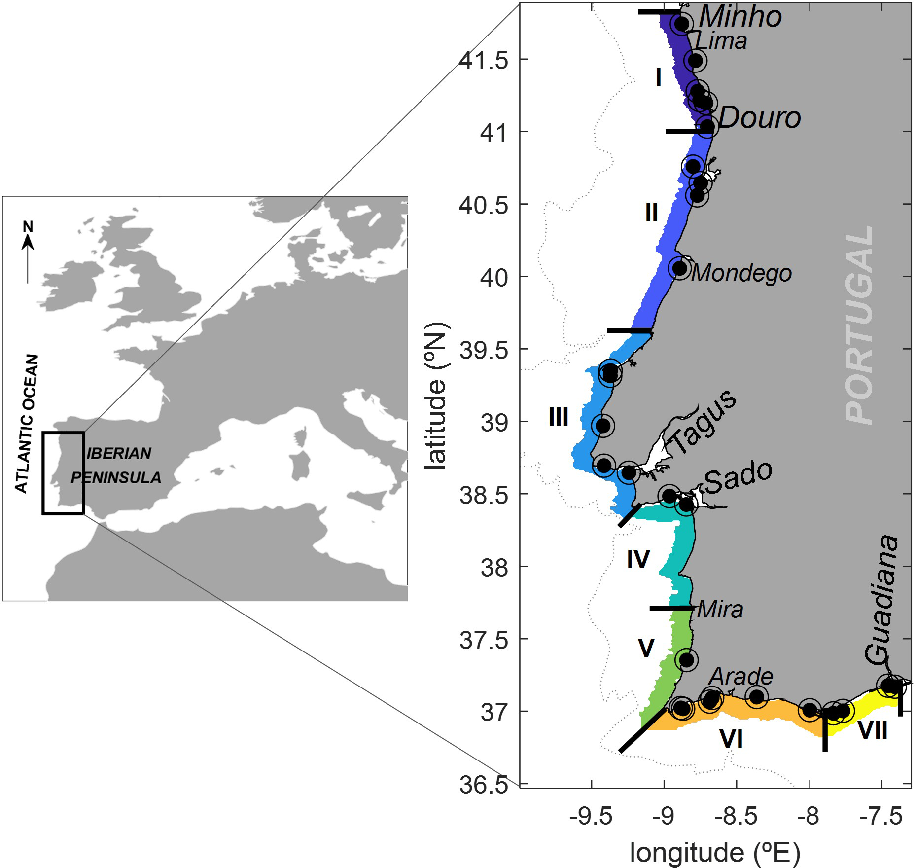 Map of the study area (Portuguese coast). Names indicate the location of estuaries of the main rivers flowing into the shelf. ◉ - Phytoplancton sampling stations. Roman numbers I to VII indicate the 7 regions/zones studied.