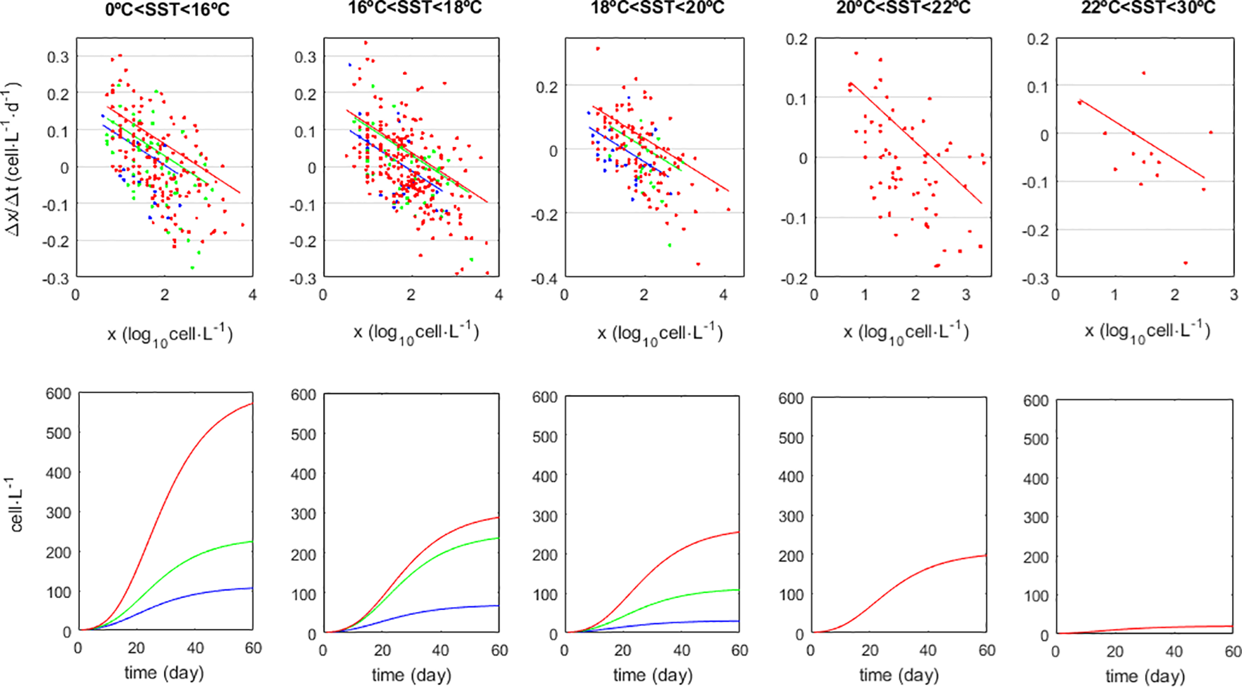 Sigmoid growth of Dyophysis acuminata populations and its dependency on Sea-Surface Temperature (SST) in °C, and Photosynthetic Active Radiation (PAR) corresponding to the flux of photons within the 400-700nm wavelengths observed at 12:00 (noon) and given in J·m-2·h-1. Colours correspond to PAR classes: (blue) PAR<6·105, (green) 6·106< PAR<9·105, (red) 9·105<PAR. Upper row panels: regression lines fit by Quantile Regression to the 75% percentile but using the pooled slope b=-0.078. Lower row panels: growth model simulations.
