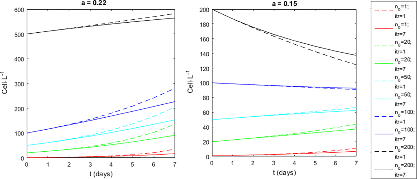 Alternative modes of model implementation. (Dashed lines) one iteration from t=0 to t=7 days. (Full lines) seven iterations (one per day) from t=0 to t=7 days. Initial conditions (n0) tested were 1, 10, 50 100 and 500 cell·L-1. Model implemented with a=0.15 or a=0.22, and b=-0.078.